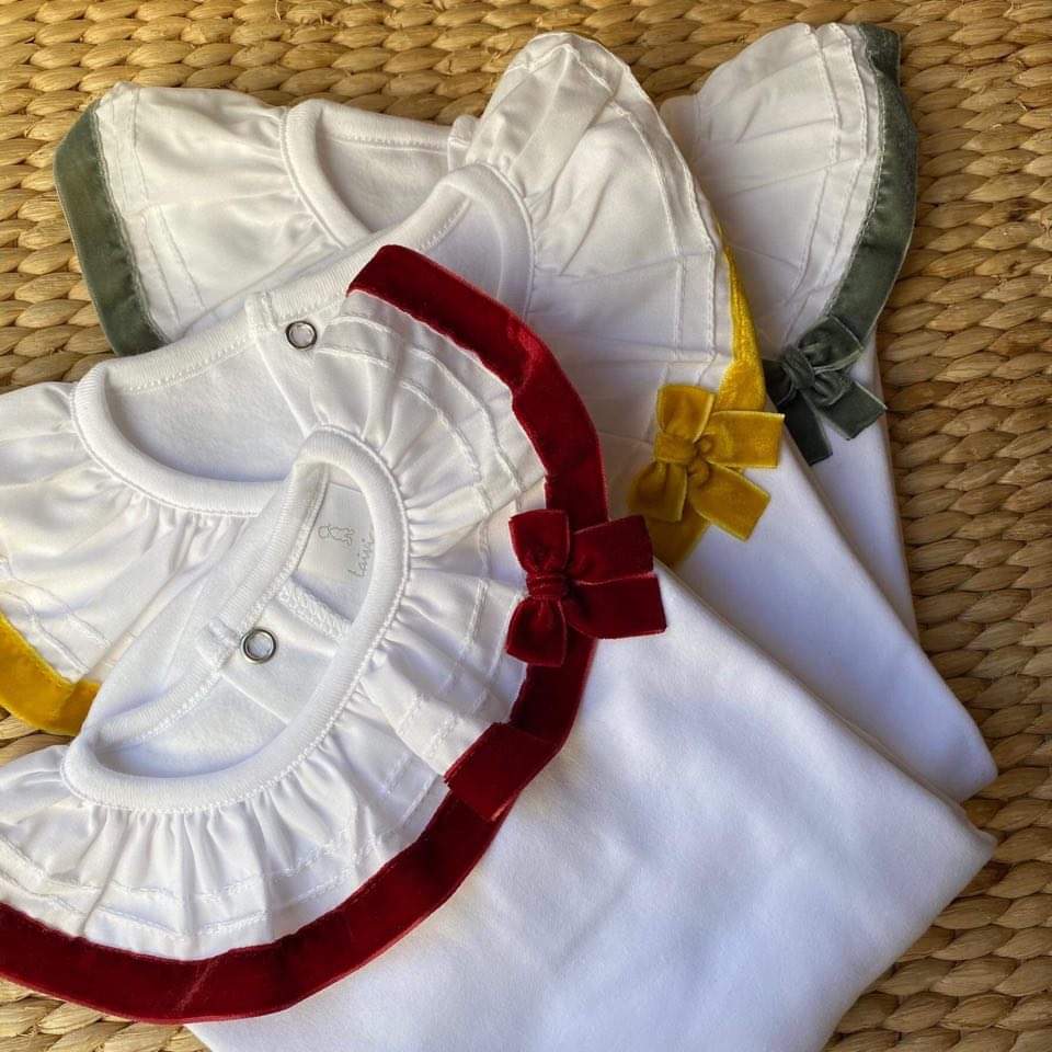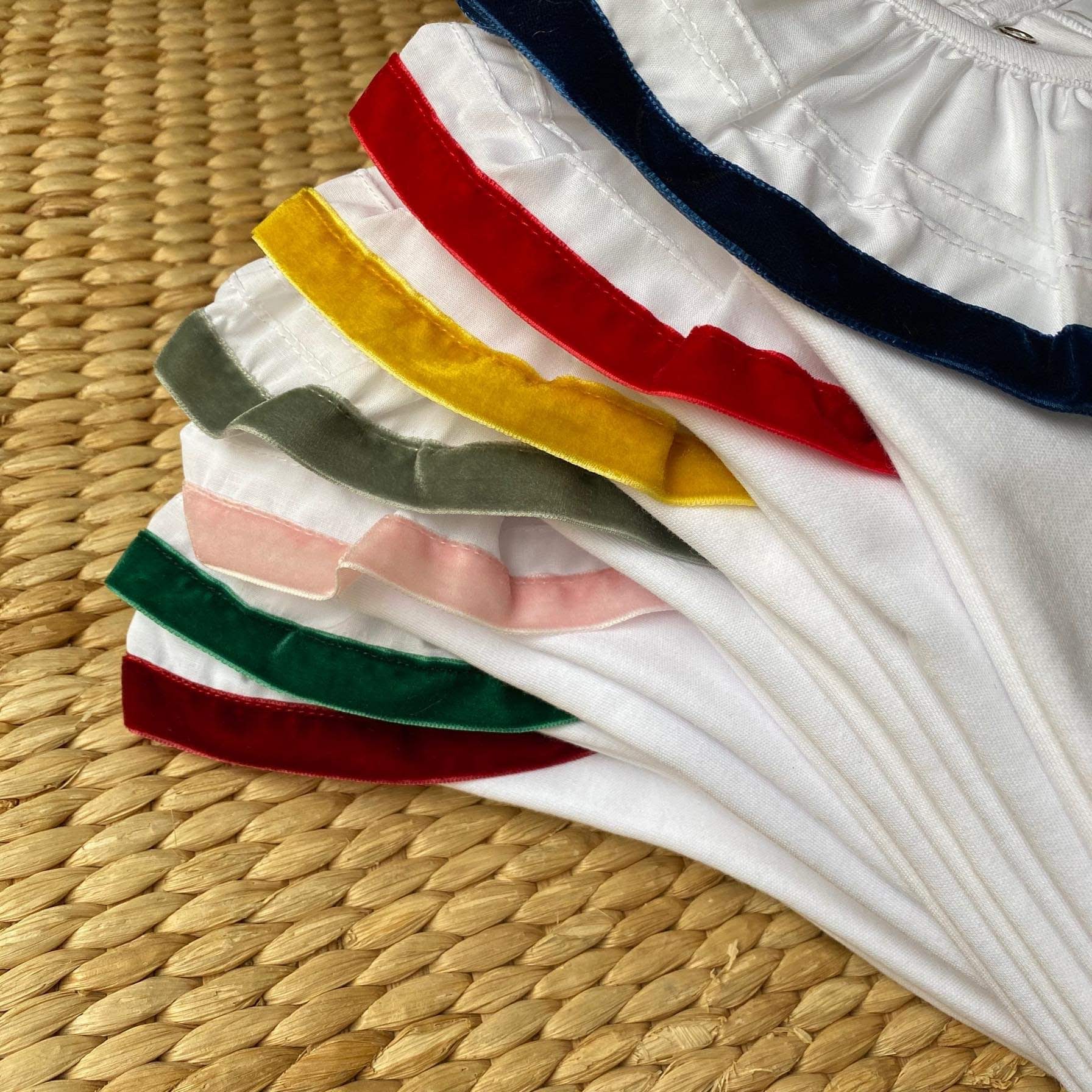 Três bodies de bebé brancos com gola franzida e laços de veludo em vermelho, amarelo e verde