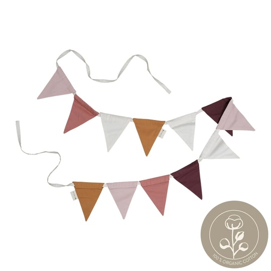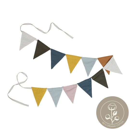 • Guirlandas de bandeirolas triangulares coloridas em algodão orgânico com selo 100% ORGANIC COTTON