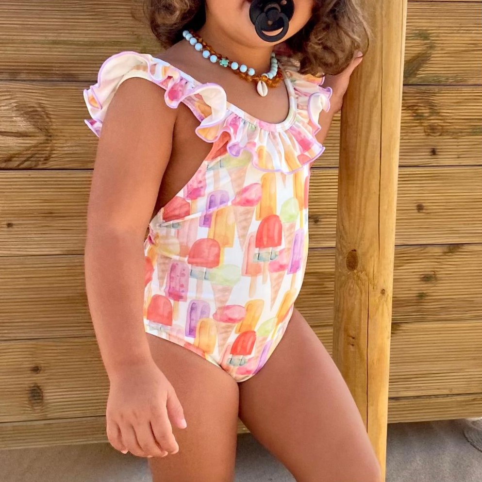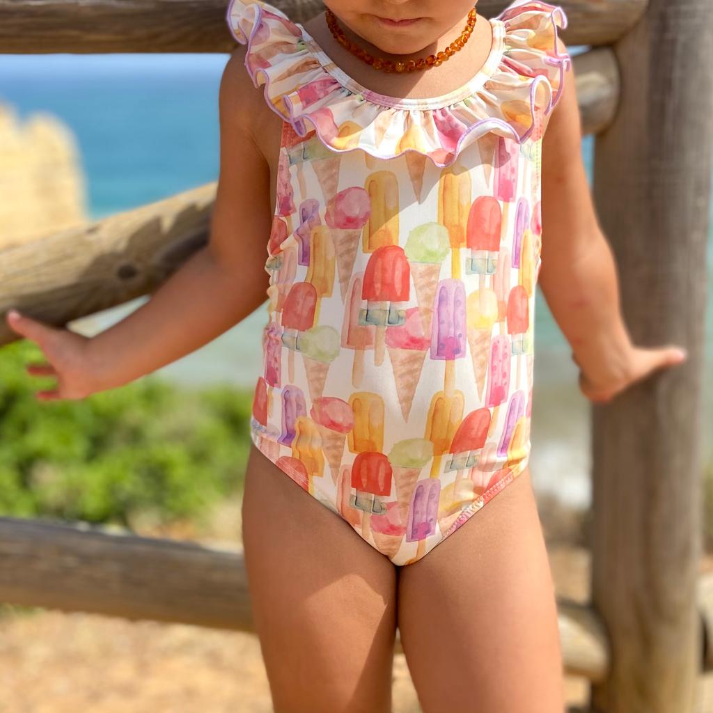 • Fato de banho infantil com estampa de gelados coloridos e volante no decote