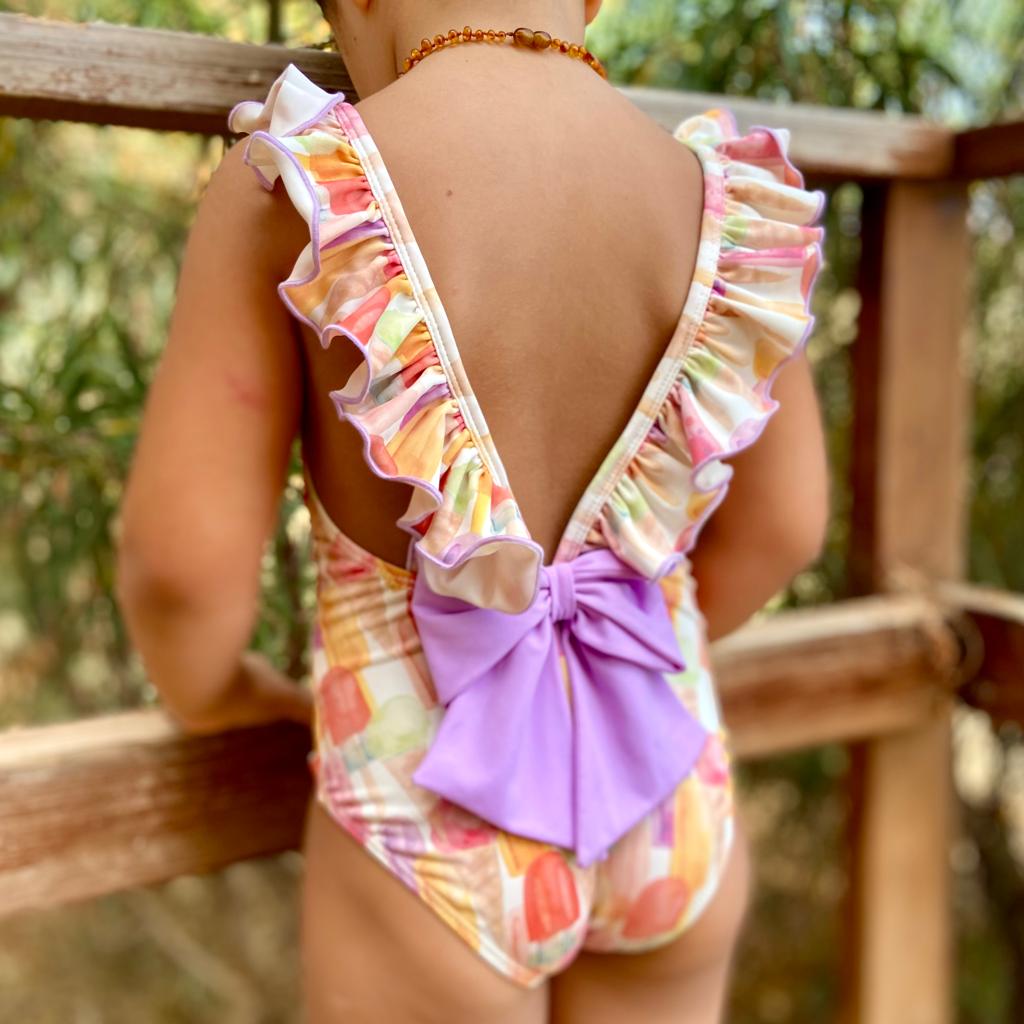 • Fato de banho infantil colorido com folhos e laço lilás nas costas