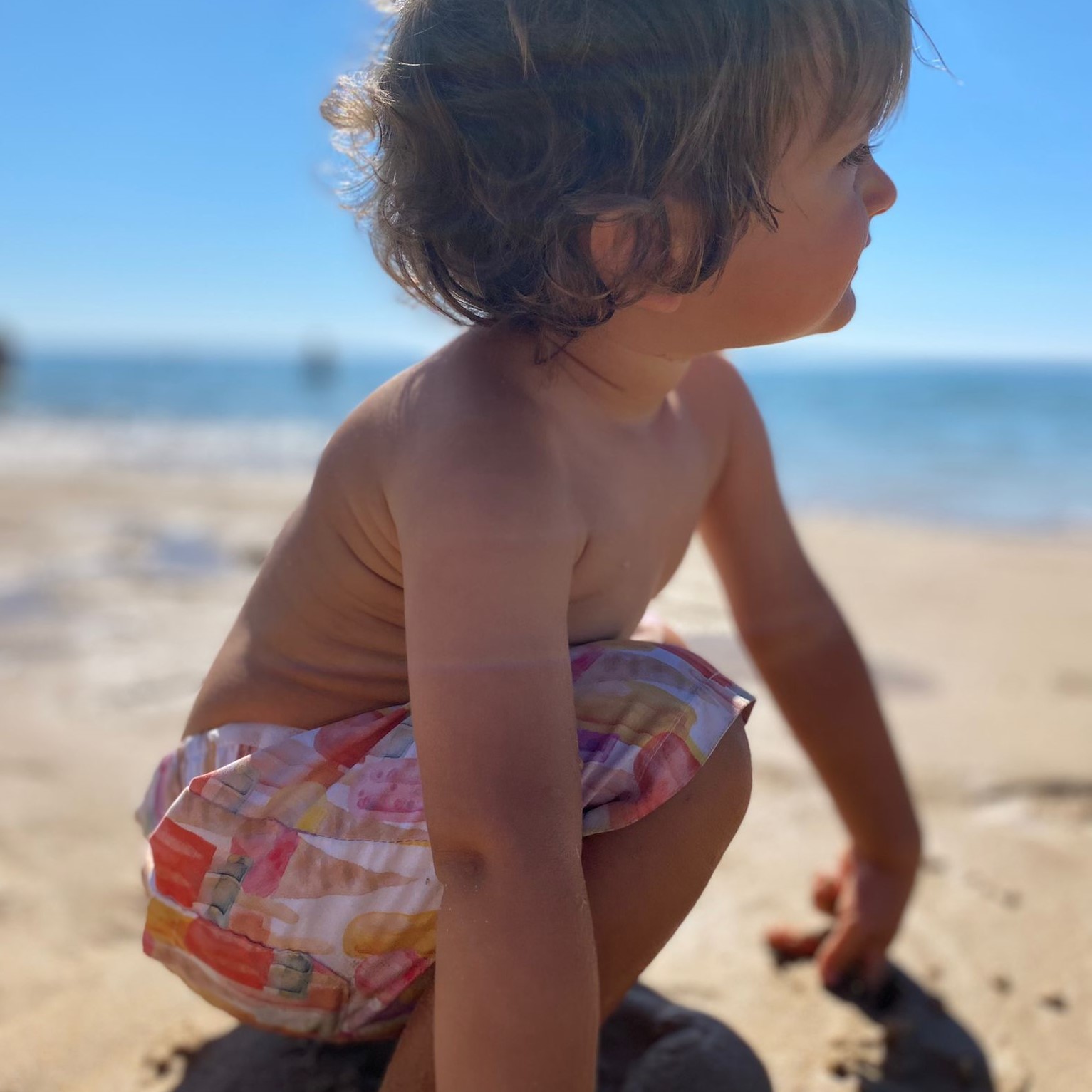• Criança com calções de banho coloridos sentada na areia da praia