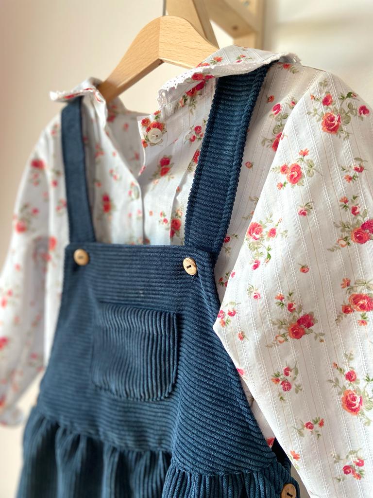 • Vestido azul de cotelê com camisa branca floral pendurados em cabides