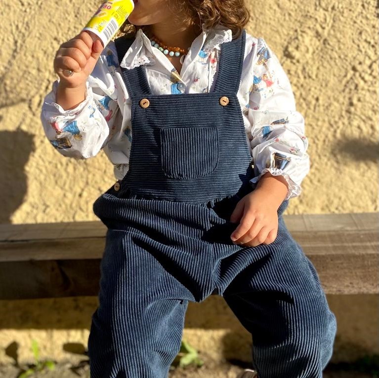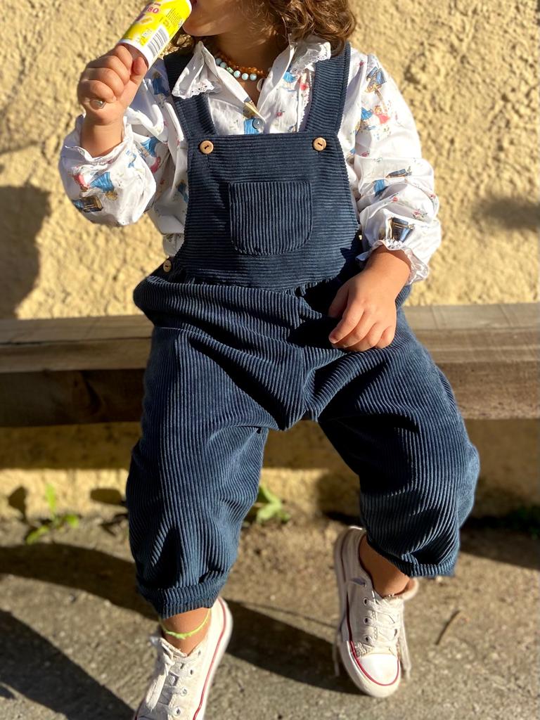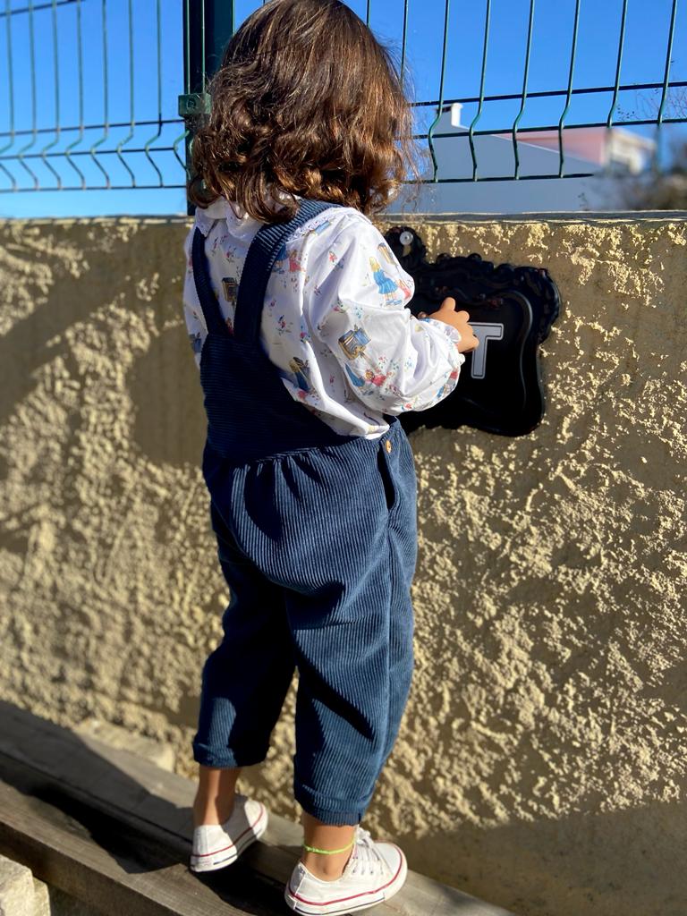 • Criança de costas usando camisa branca com padrão, calças azul-marinho de veludo cotelê com alças, junto a uma parede amarela rugosa