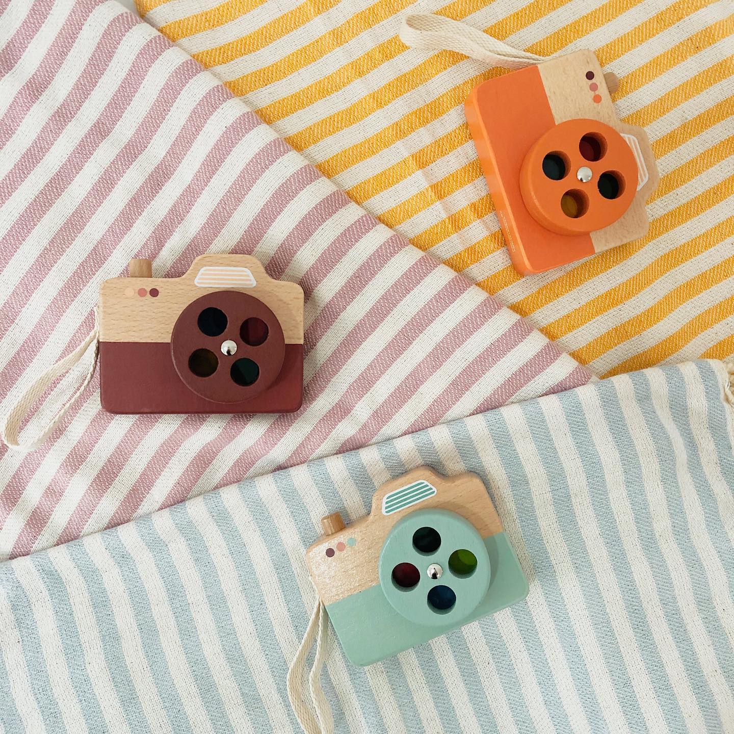 • Câmaras de brinquedo de madeira coloridas sobre tecidos listrados amarelo, lilás e azul