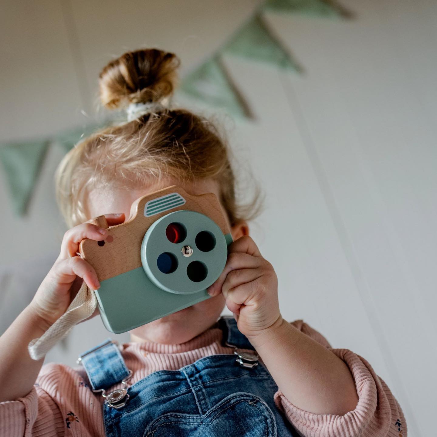 • Criança a brincar com câmara fotográfica de brinquedo em madeira