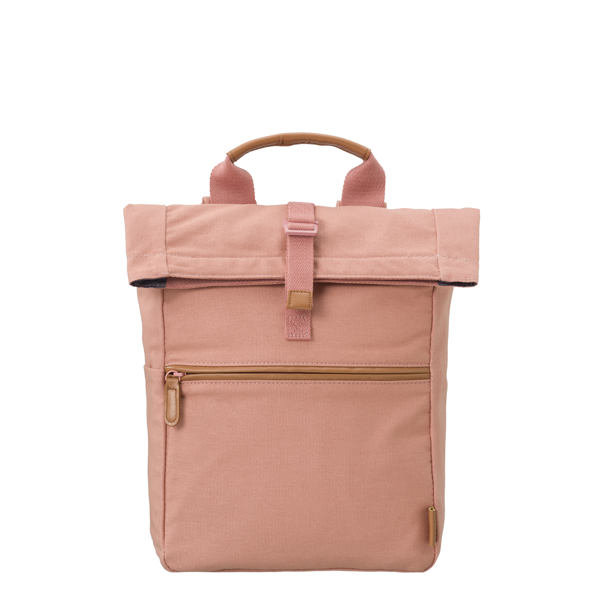 • Mochila rosa com bolso frontal e alça castanha clara