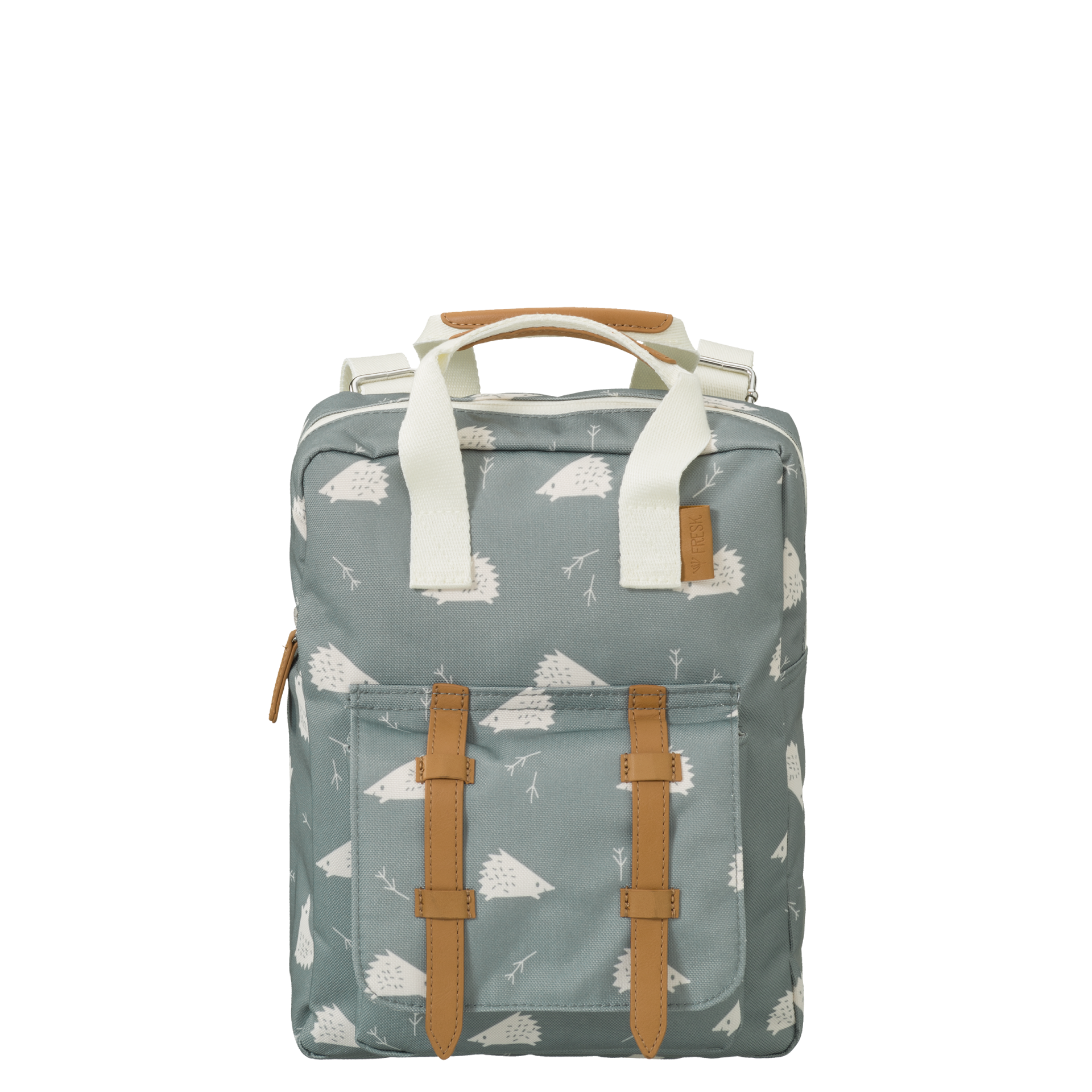 • Mochila quadrada cinzento-azulado com padrão branco de ouriços e ramos e alças bege