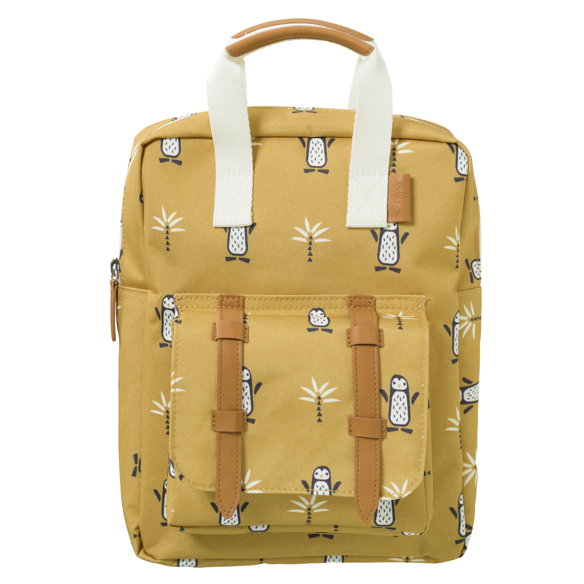 • Mochila amarela com padrão de pinguins e árvores, alças brancas e detalhes em castanho claro