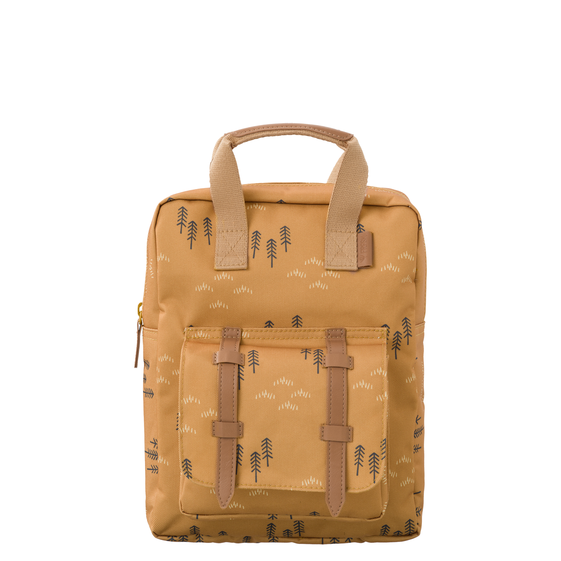 • Mochila castanha com padrão de árvores pretas e bolso frontal com correias castanhas