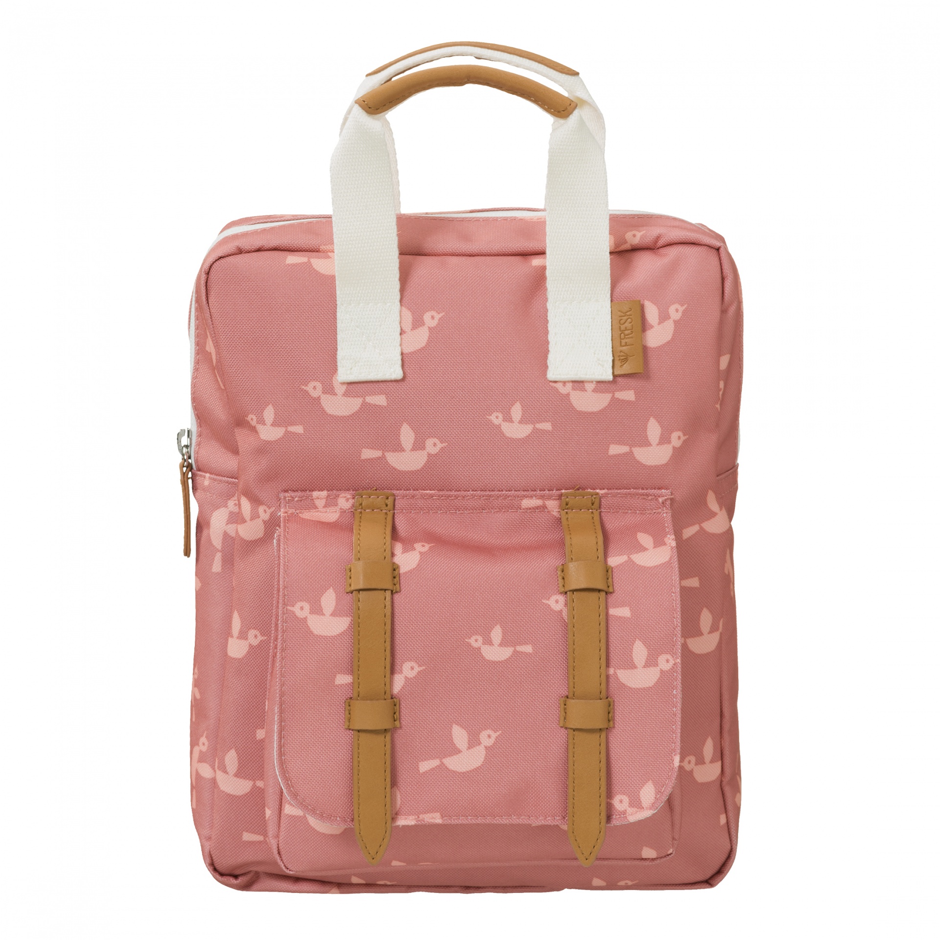 • mochila cor-de-rosa com padrão de pássaros brancos e detalhes castanhos