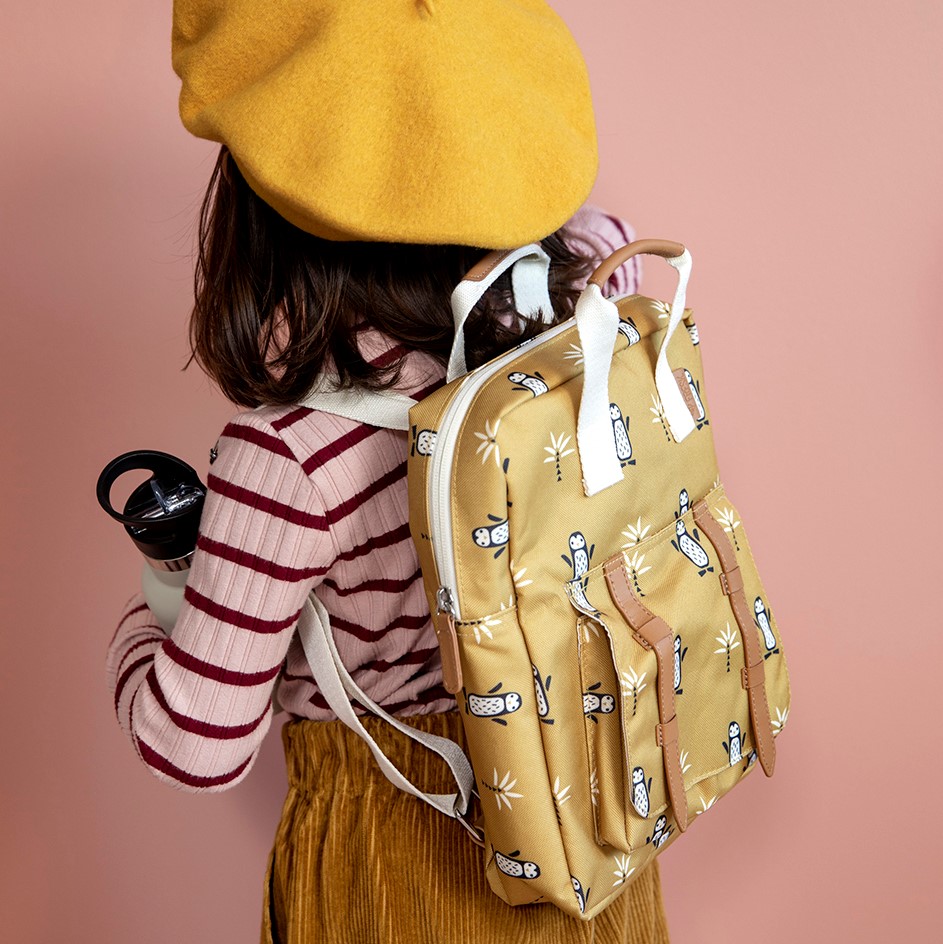 • Mochila castanha com padrão de corujas, alças brancas e rosa, usada por criança com boina amarela