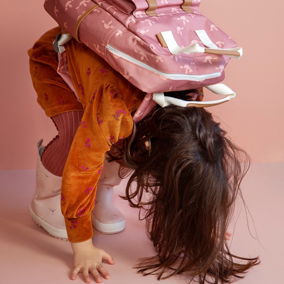 • Mochila rosa com padrão de flamingos brancos em criança com roupa laranja