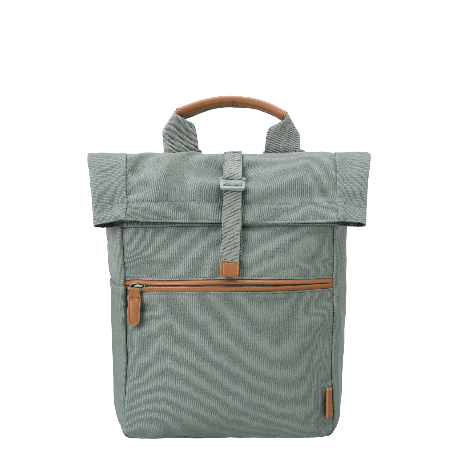 • Mochila cinza esverdeado com alça castanha e bolso frontal