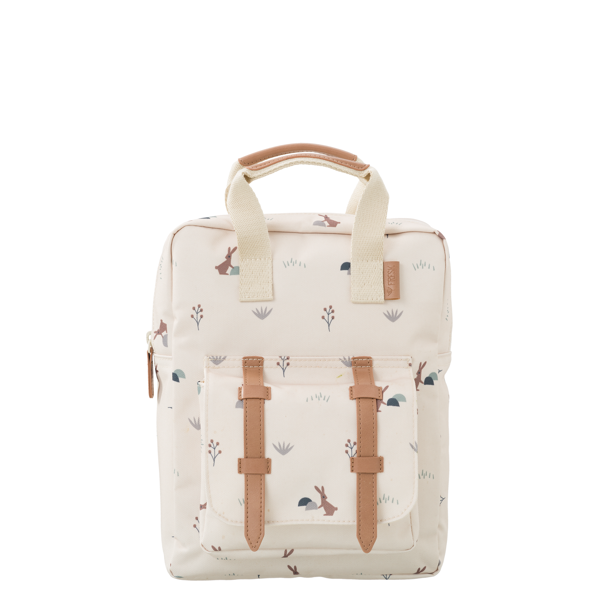 • Mochila bege com padrão de coelhos e alças castanhas