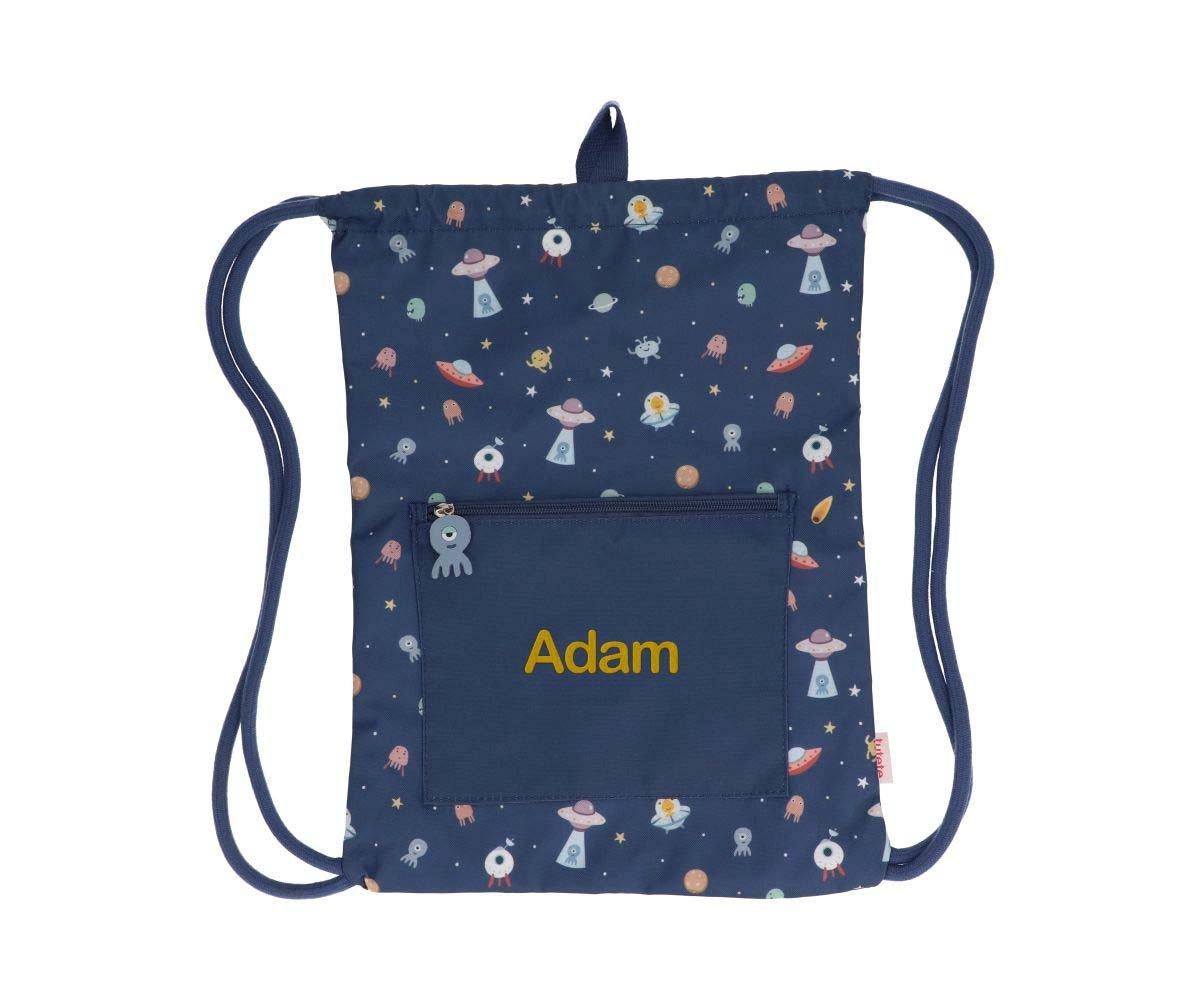 • Mochila saco azul escuro com padrão espacial e bolso com nome Adam