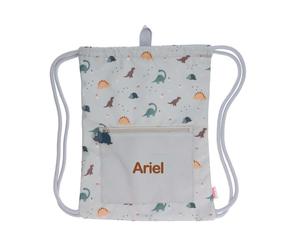 • Mochila de cordão cinza com padrão de dinossauros e bolso com nome Ariel