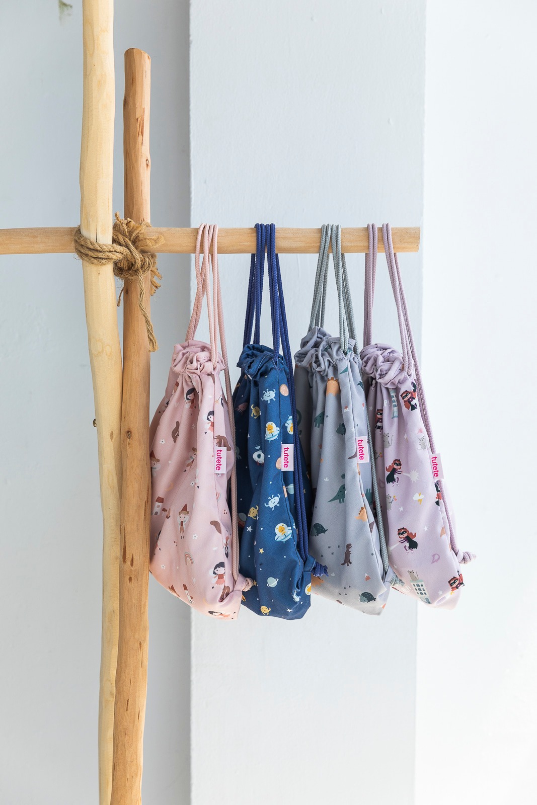 • Cinco mochilas de tecido coloridas com estampados diversas penduradas num cabide de madeira