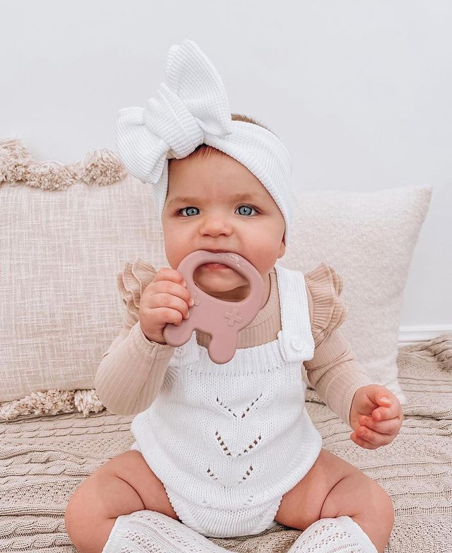 • Bebé com mordedor verde e manta bege