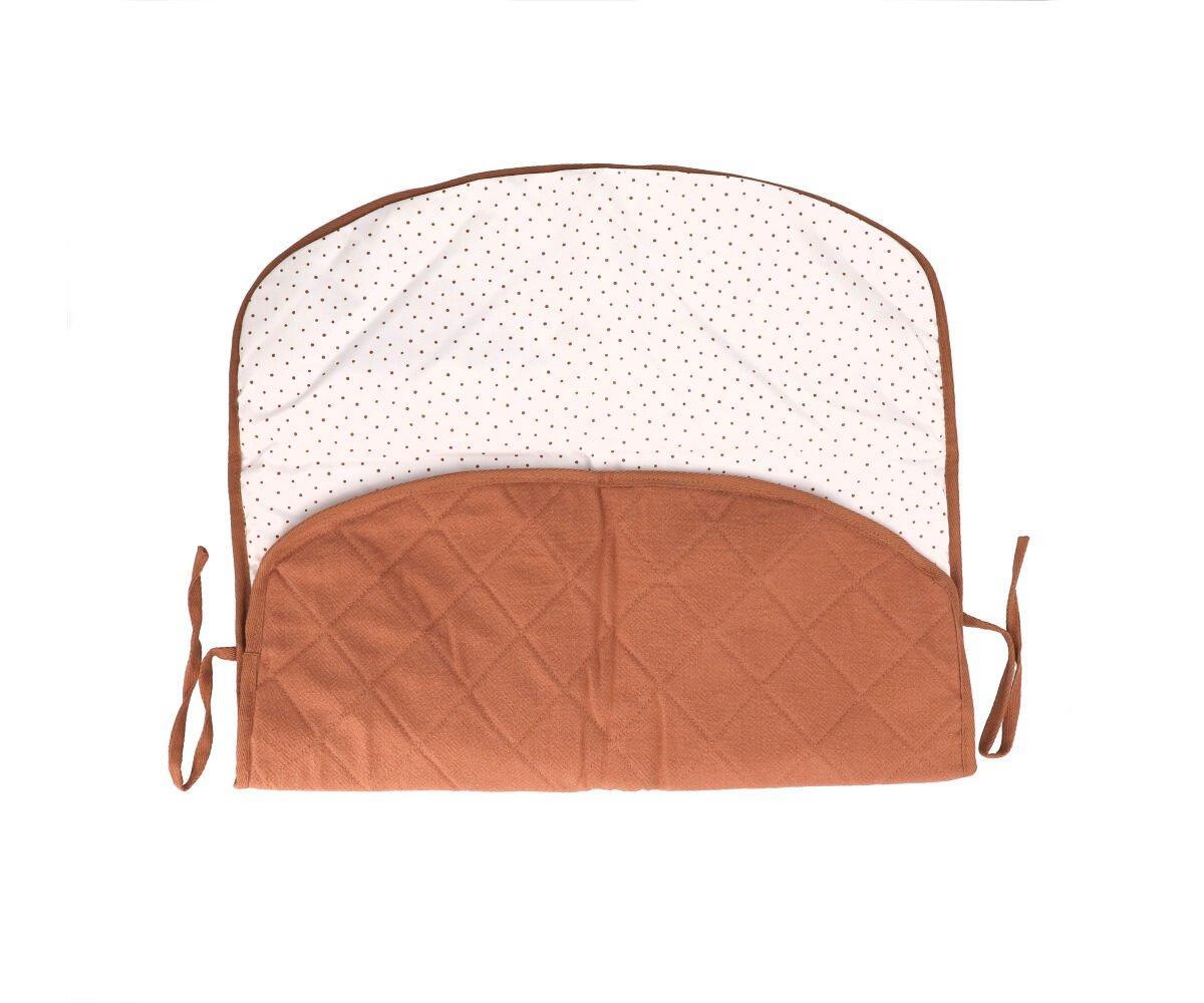 • Almofada de suporte castanha com tecido branco de pontos e tiras laterais