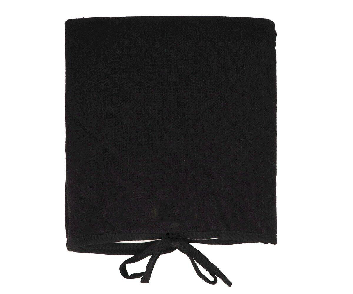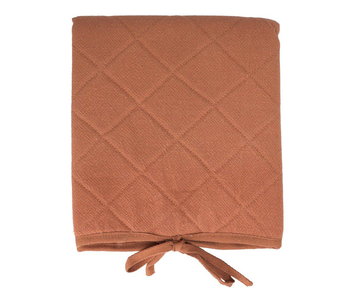 • Cobertor castanho com padrão de losangos e cordões amarrados na parte inferior