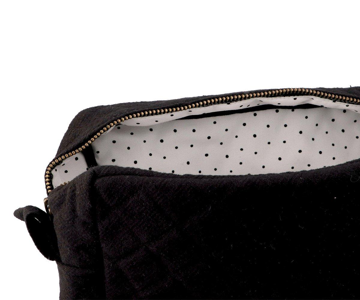 • Mala preta acolchoada com interior branco de pontos pretos e fecho metálico.