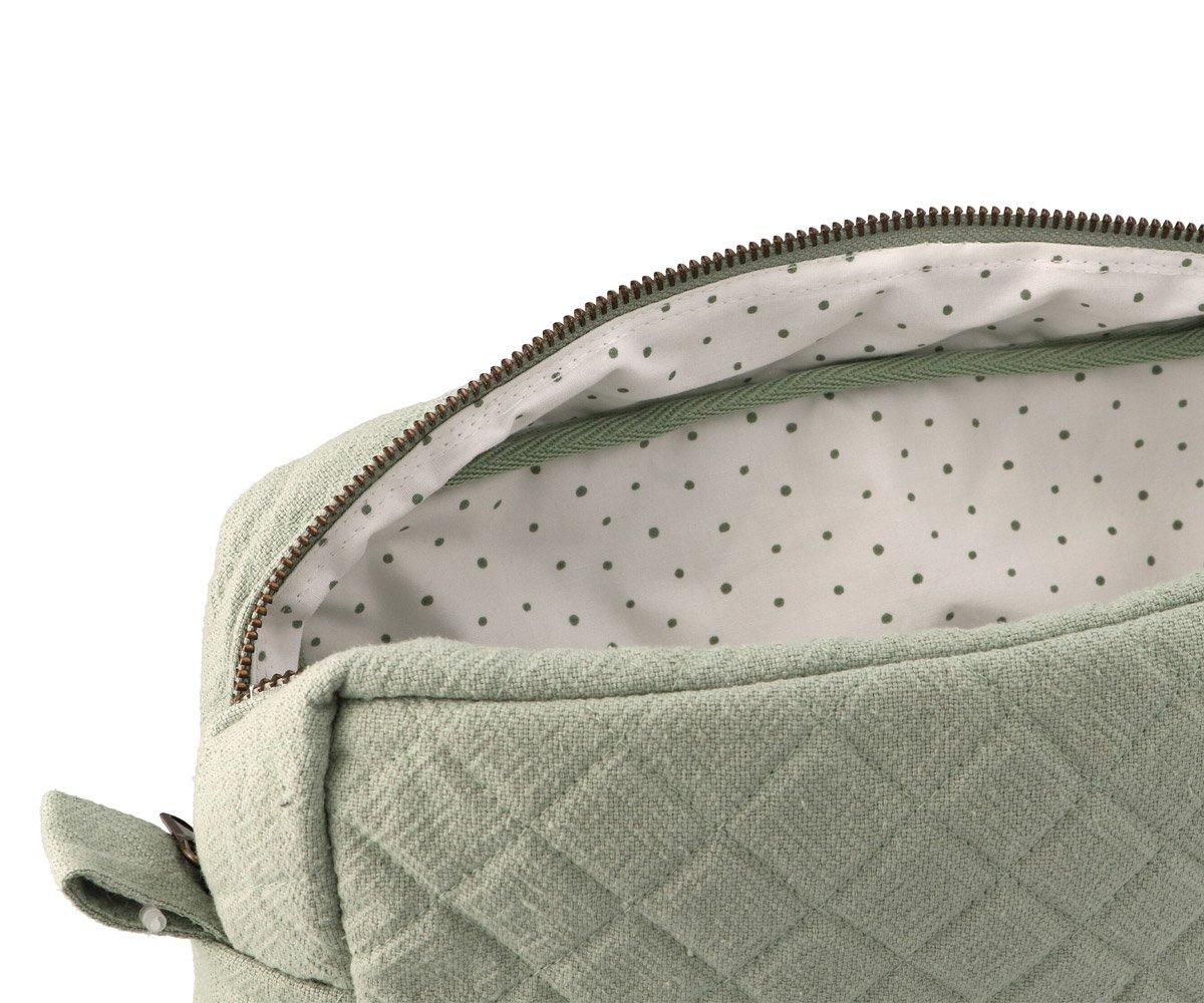 • Necessaire verde claro com textura matelassê e interior branco com pontos verdes