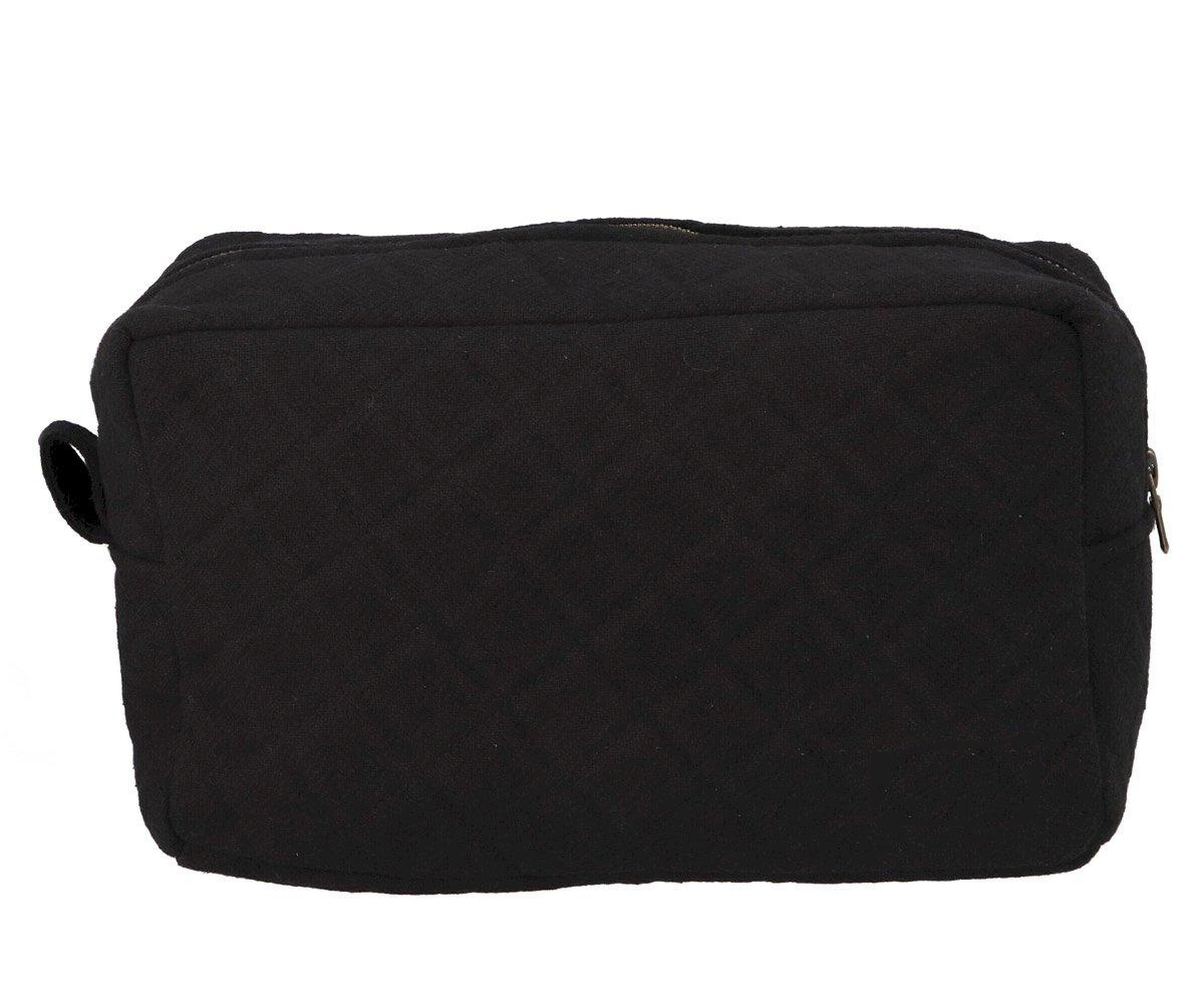 • Estojo retangular preto com textura quadriculada e fecho de correr