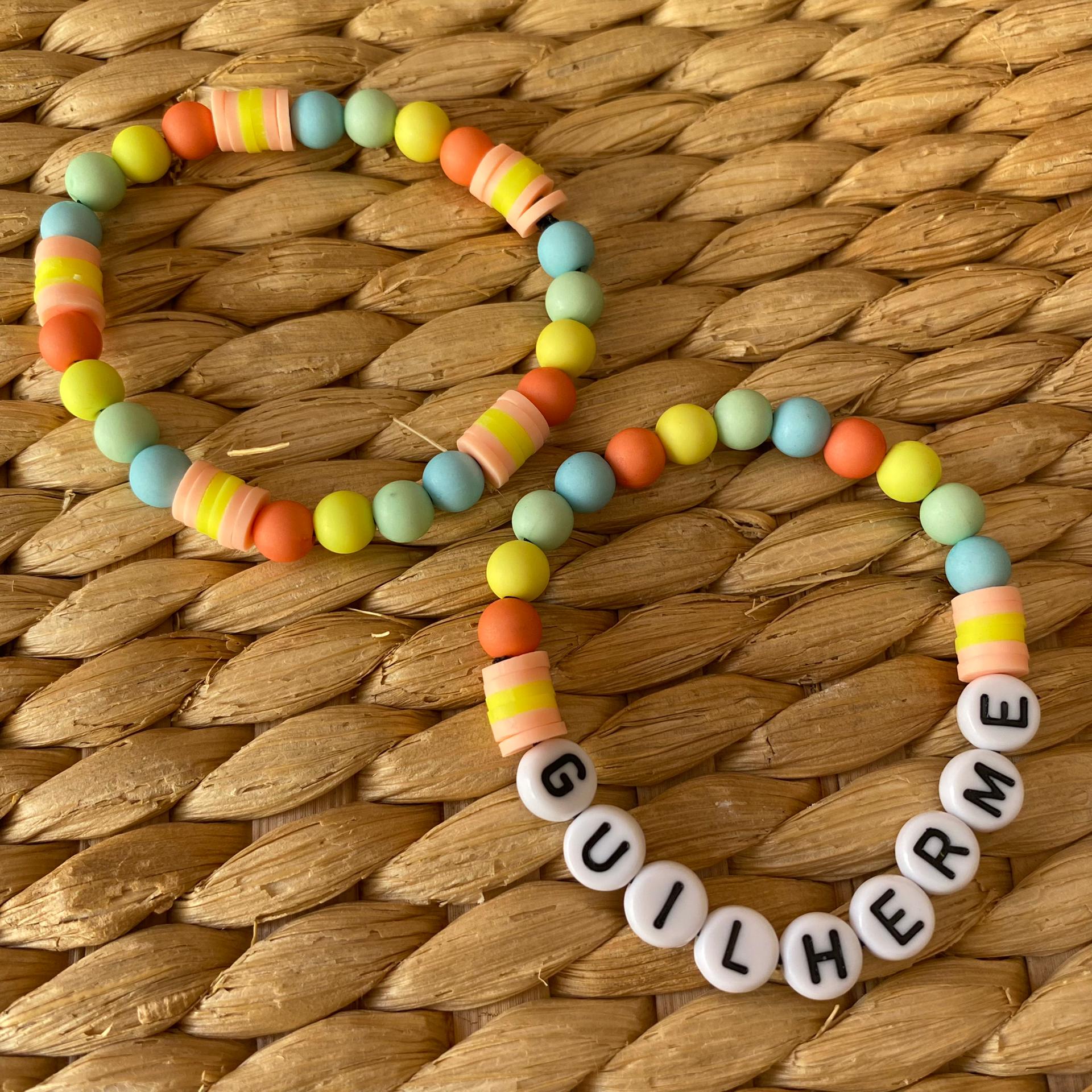• Duas pulseiras coloridas de contas plásticas com letras formando a palavra GUILHERME numa superfície de palha.