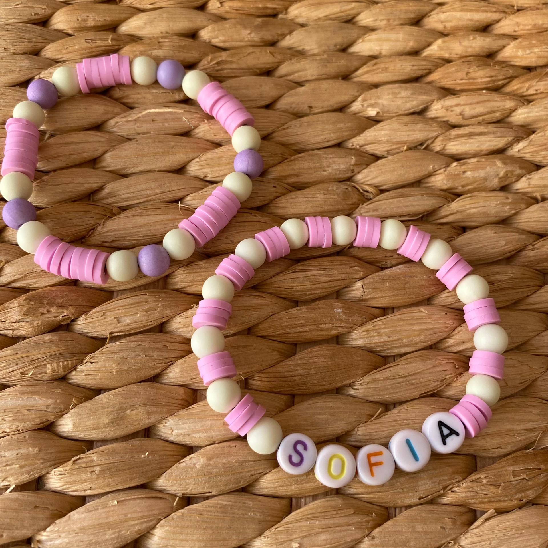 • Duas pulseiras elásticas com contas coloridas rosa, lilás e creme e uma com o nome SOFIA