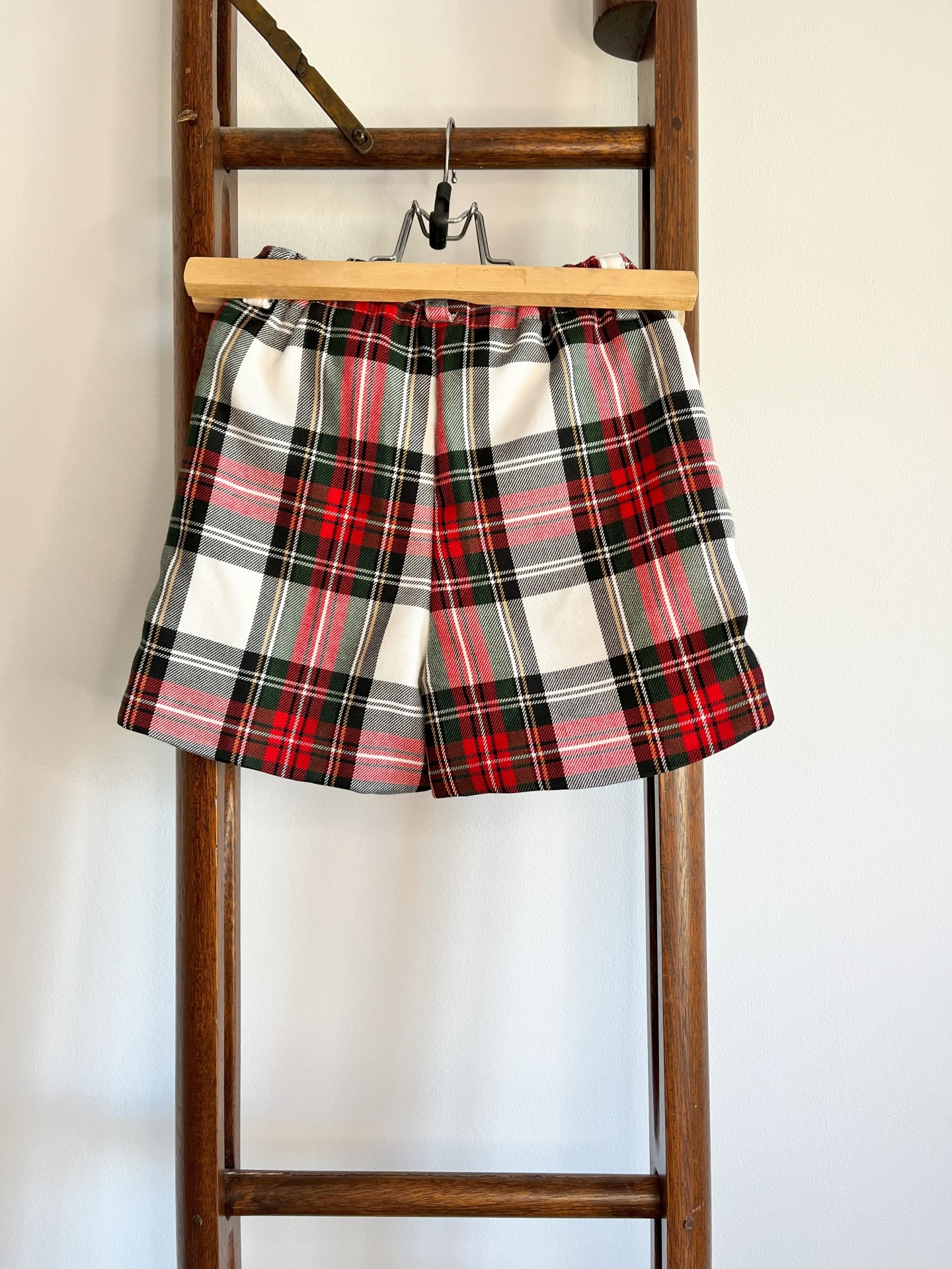 • Shorts xadrez vermelho, preto, branco e cinza pendurados numa escada de madeira