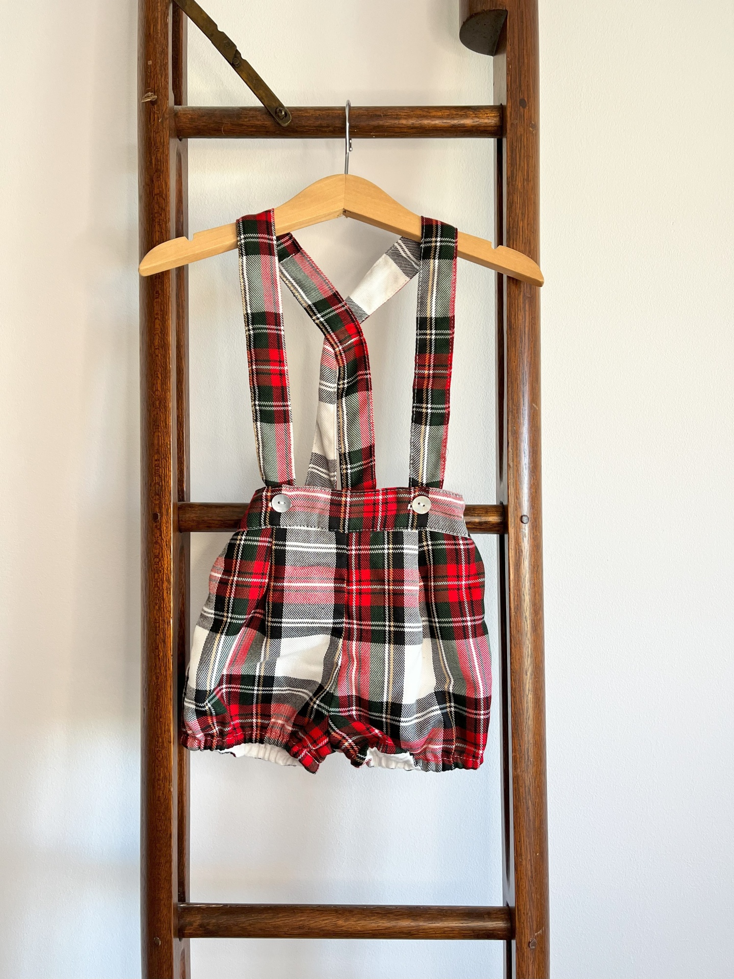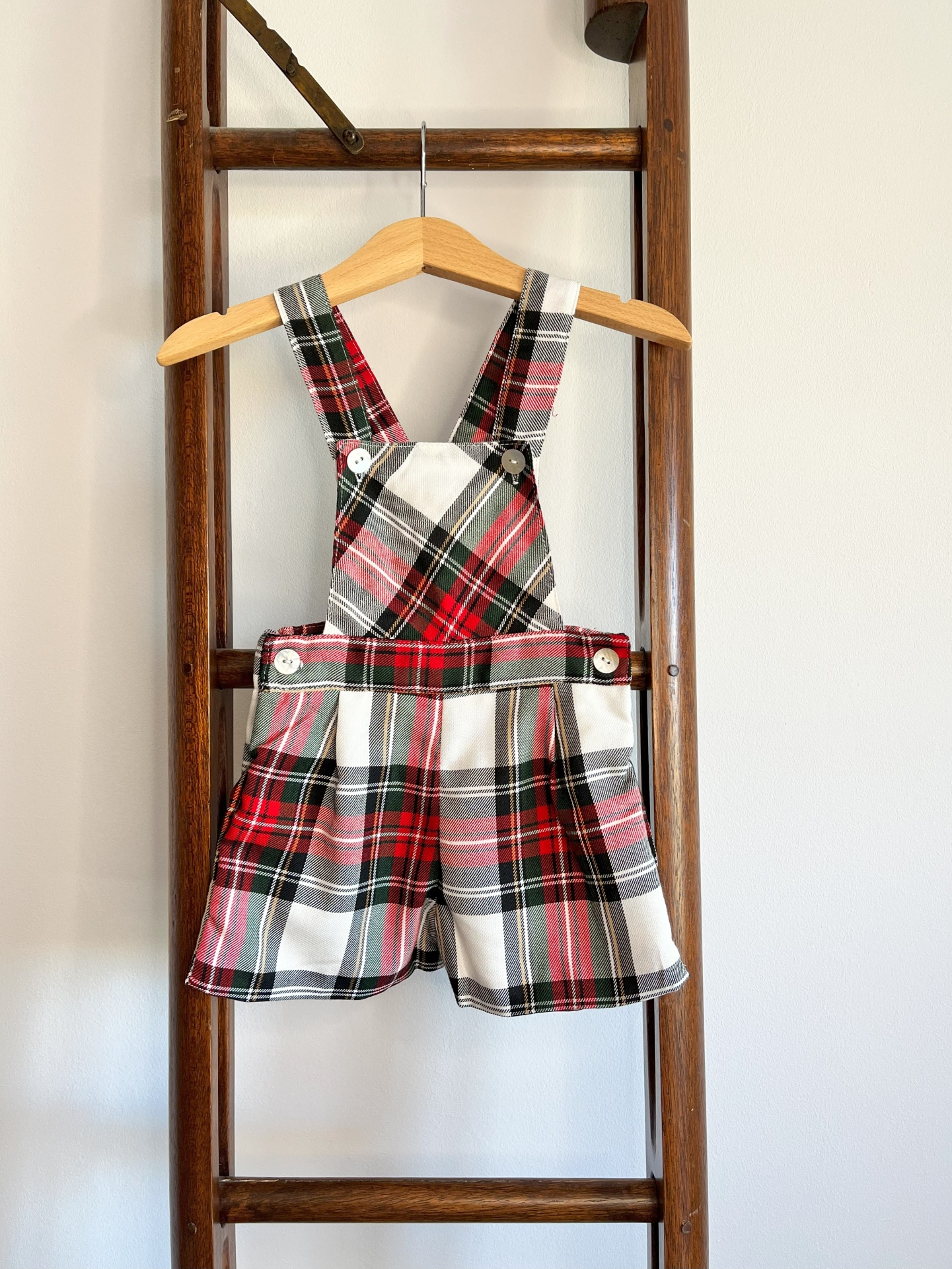 • Calções com tirantes de bebé em padrão xadrez com botões pendurados em escada de madeira.