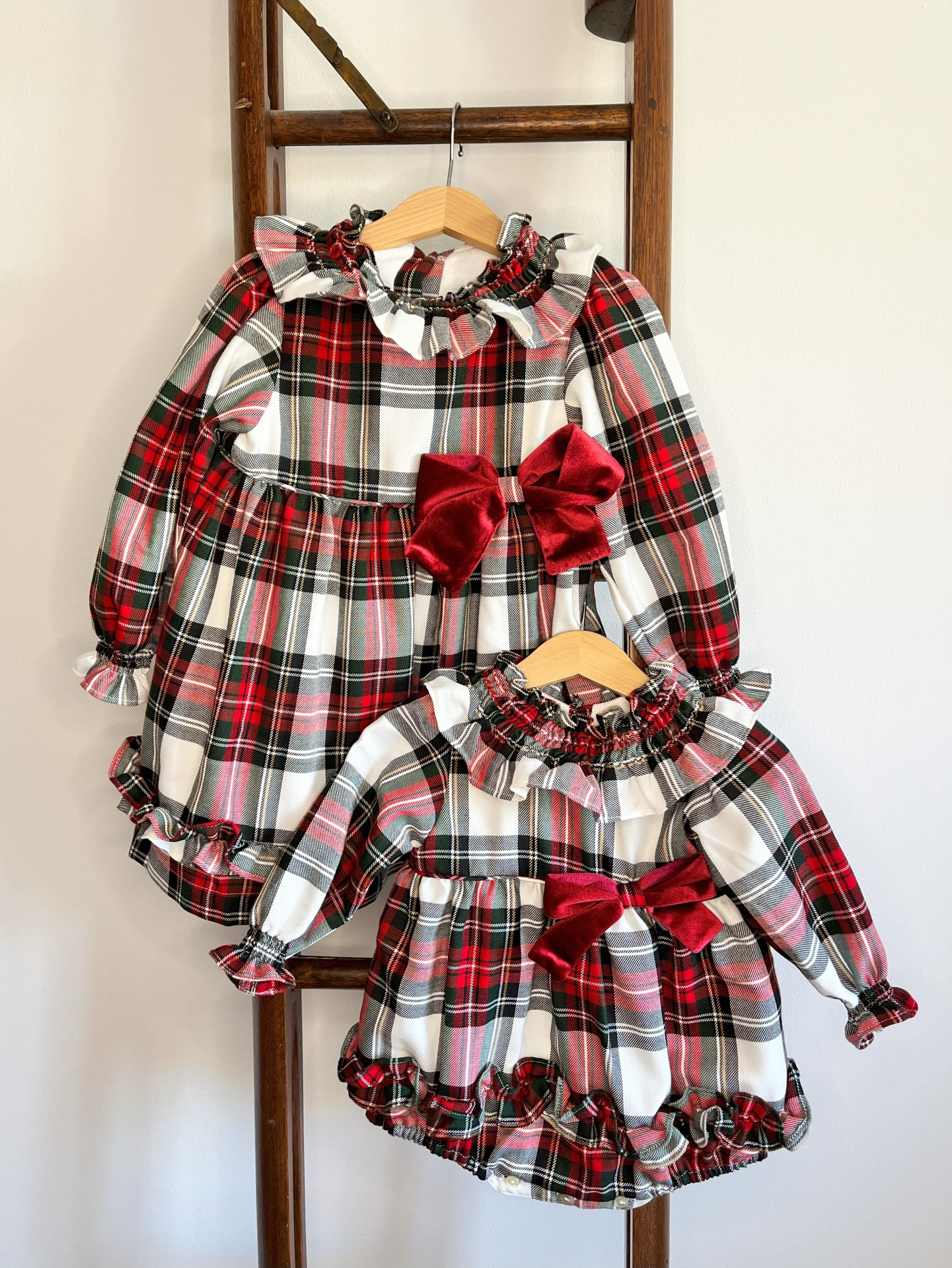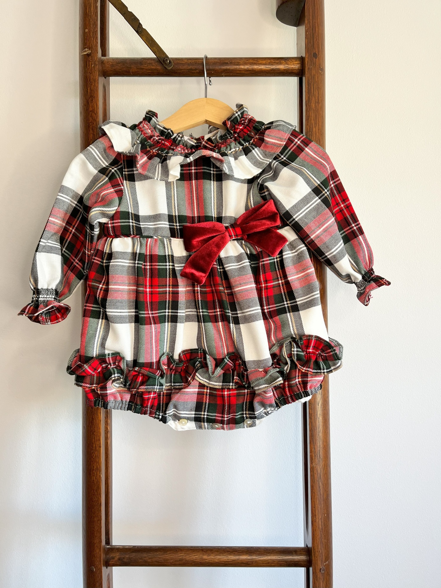 • Macacão de bebé xadrez com laço vermelho pendurado numa estrutura de madeira