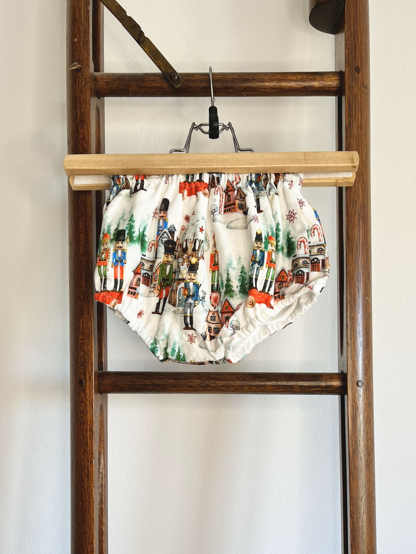 • Cuecas de bebé com estampado de soldadinhos coloridos penduradas em cabide de madeira