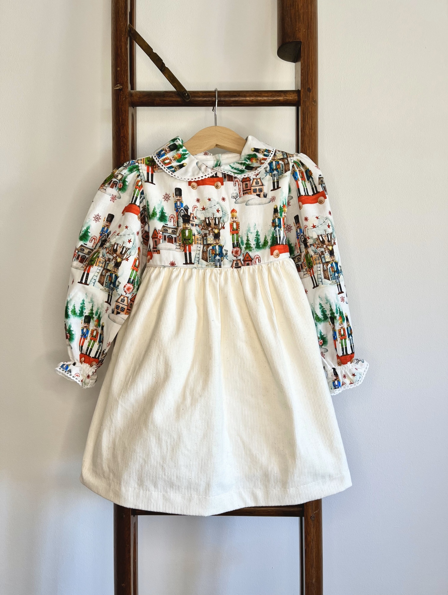 • Vestido infantil com estampado de soldadinhos de chumbo e inverno em fundo branco, saia e gola brancas, pendurado em estrutura de madeira.