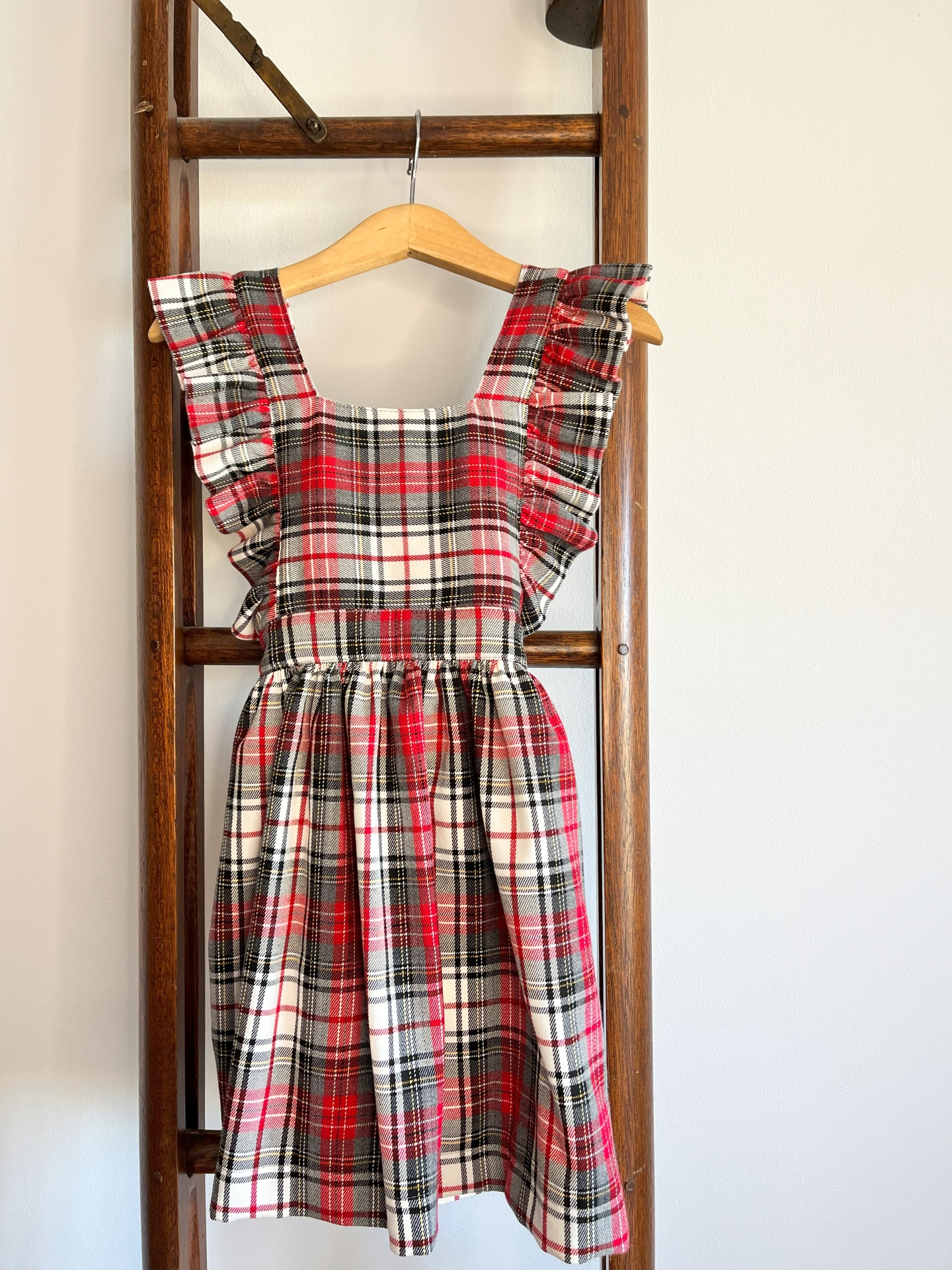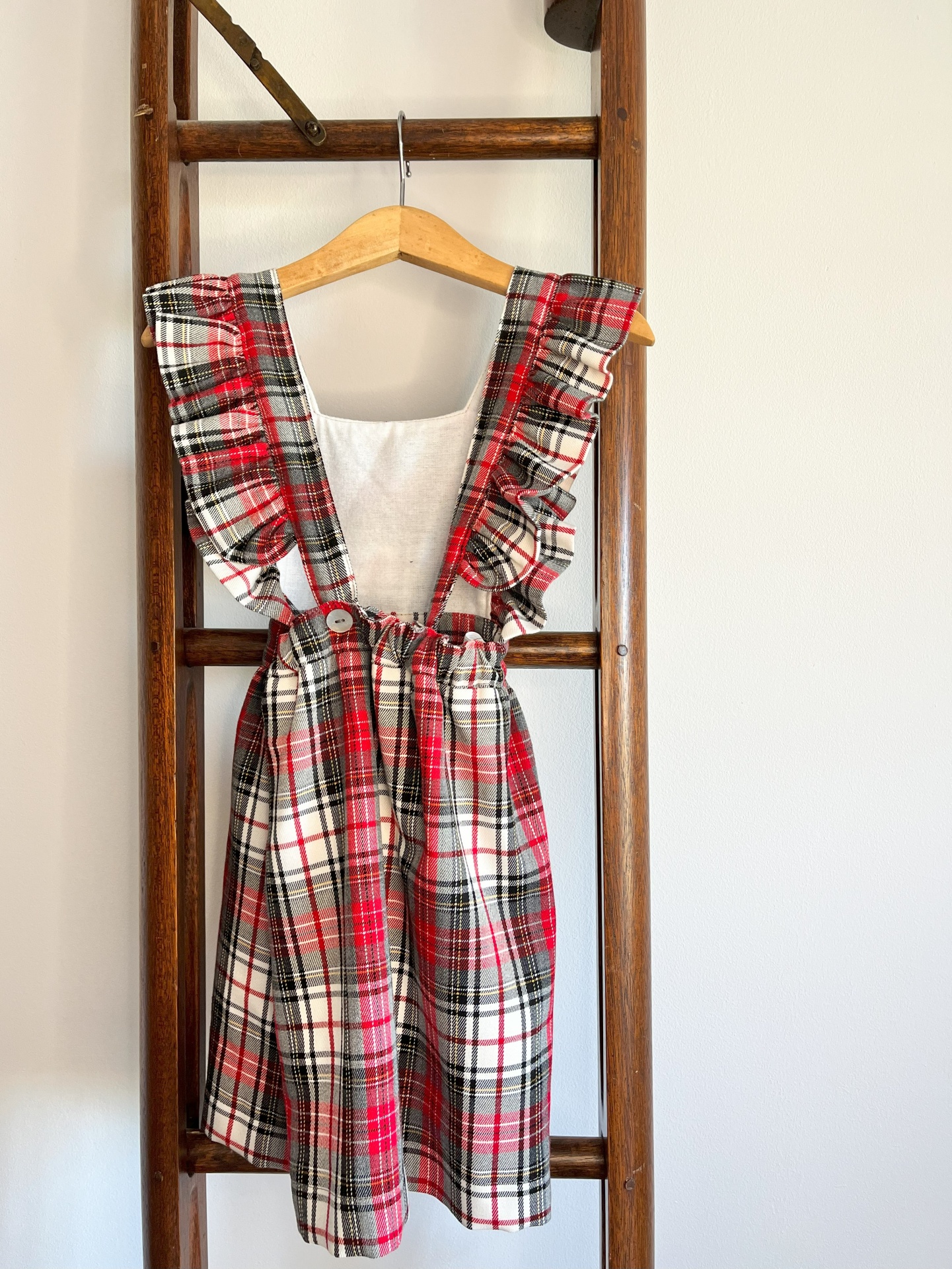 • Vestido infantil xadrez vermelho com babados pendurado em cabide de madeira