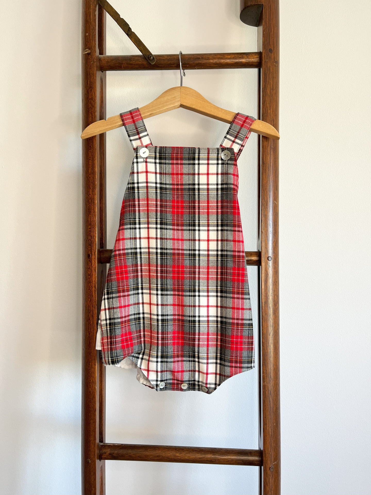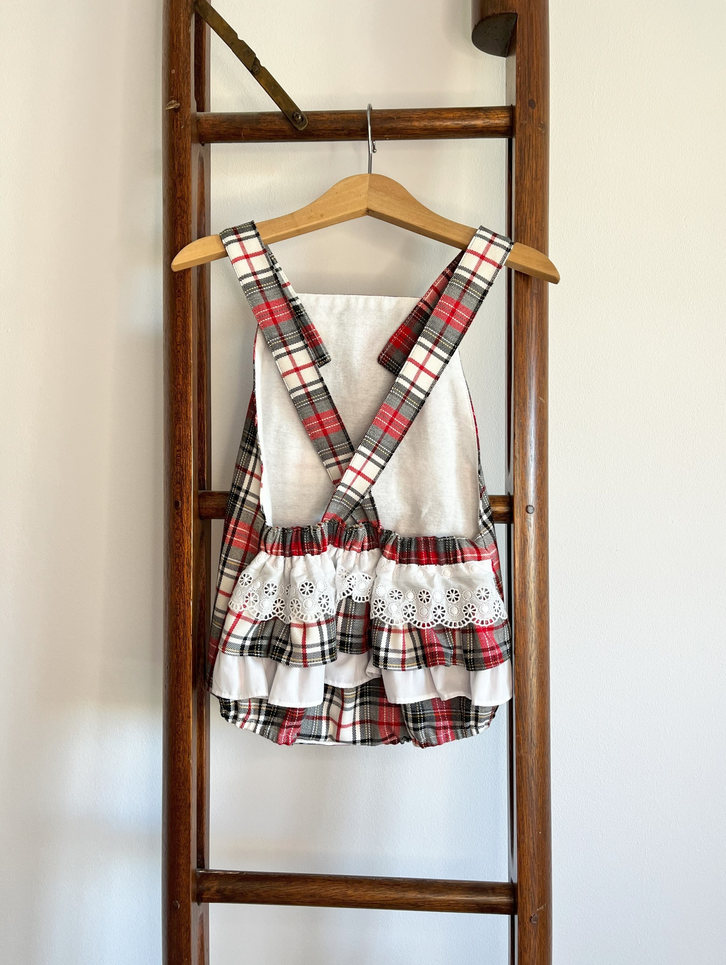 • Jardineira xadrez vermelha para bebé pendurada em cabide de madeira numa escada rústica
