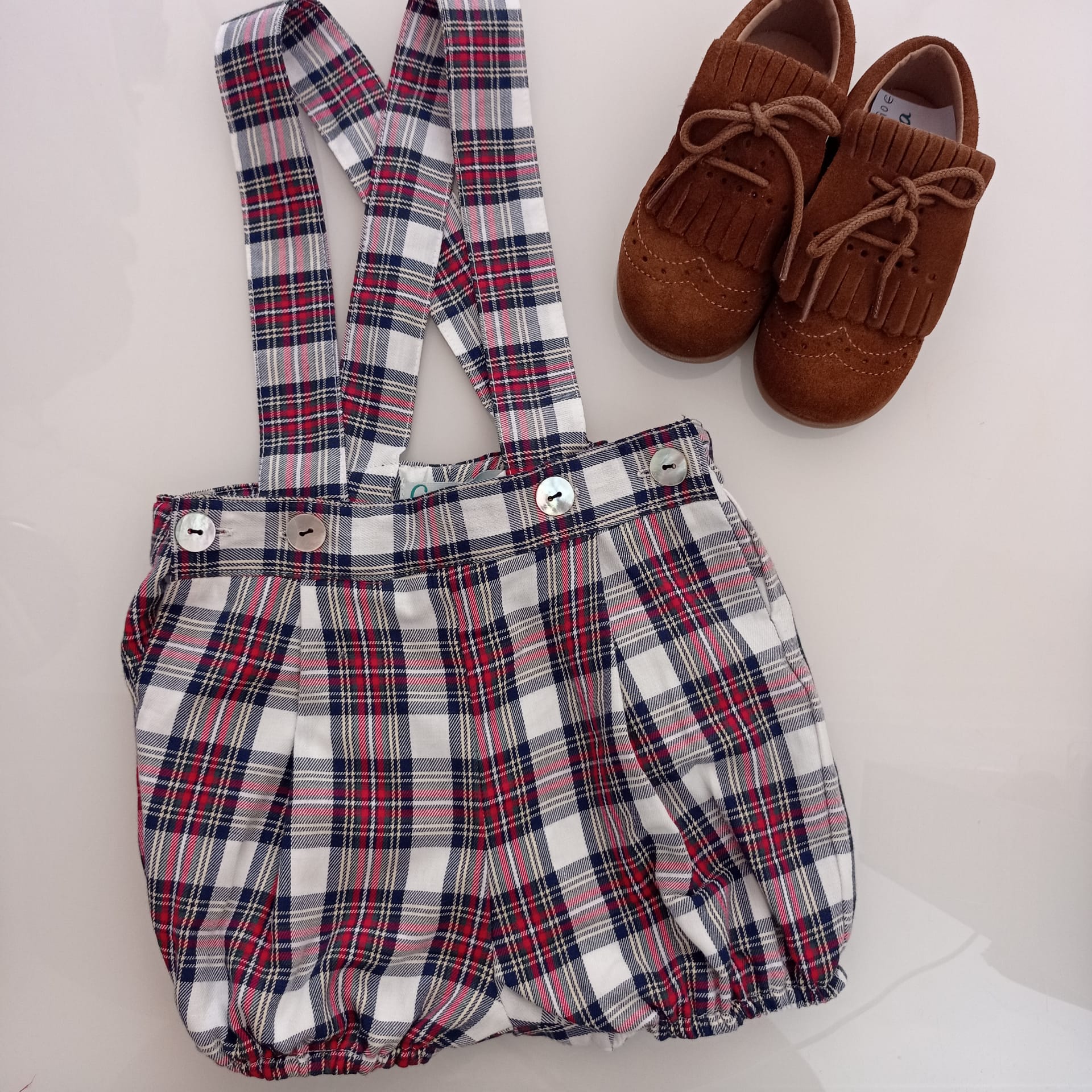 • Calças bombazine xadrez vermelho azul branco preto com suspensórios e sapatos castanhos de camurça