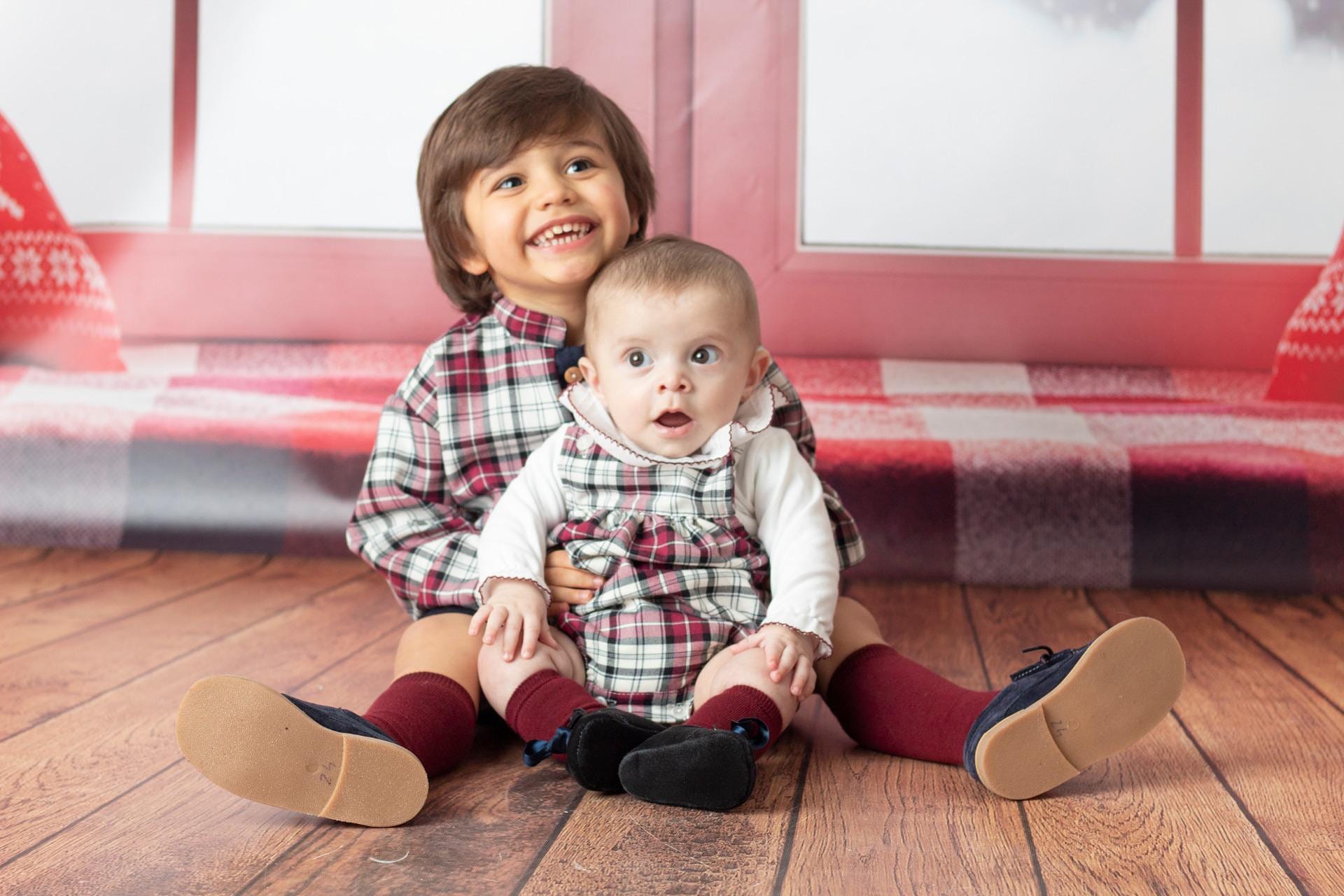 • Duas crianças sentadas no chão, roupa aos quadrados vermelho, preto e branco.