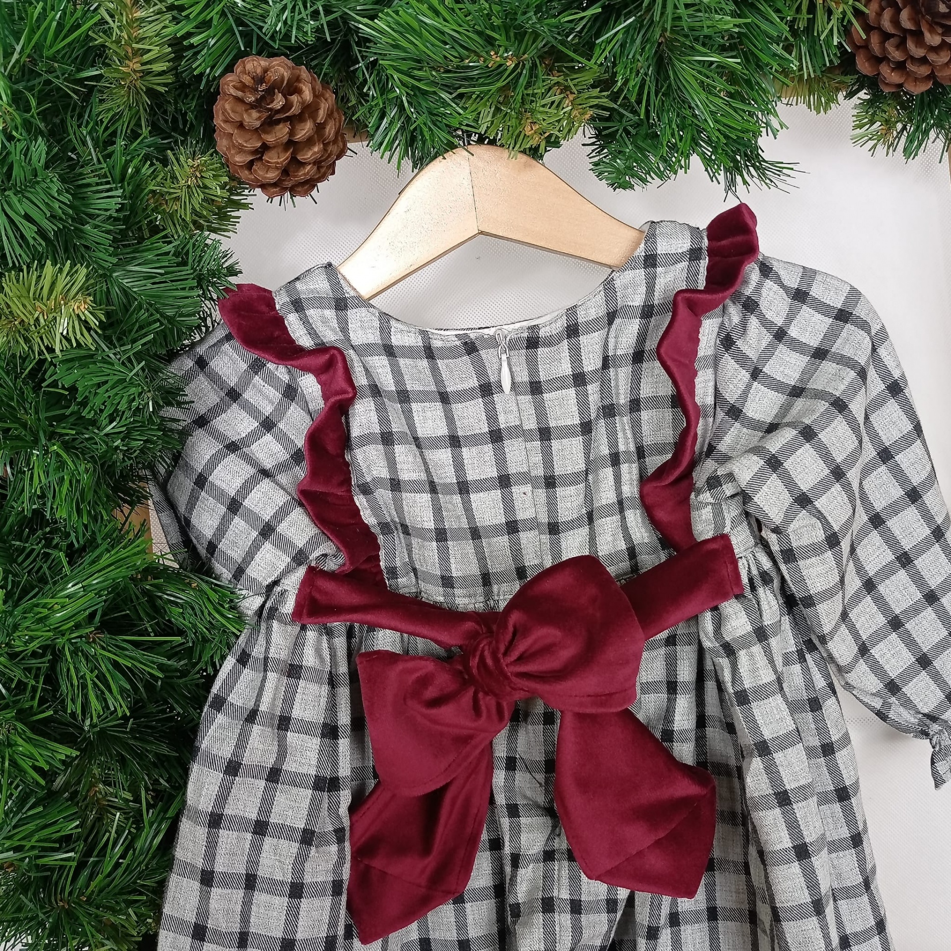 • Vestido infantil xadrez branco e cinzento com detalhes em veludo vermelho