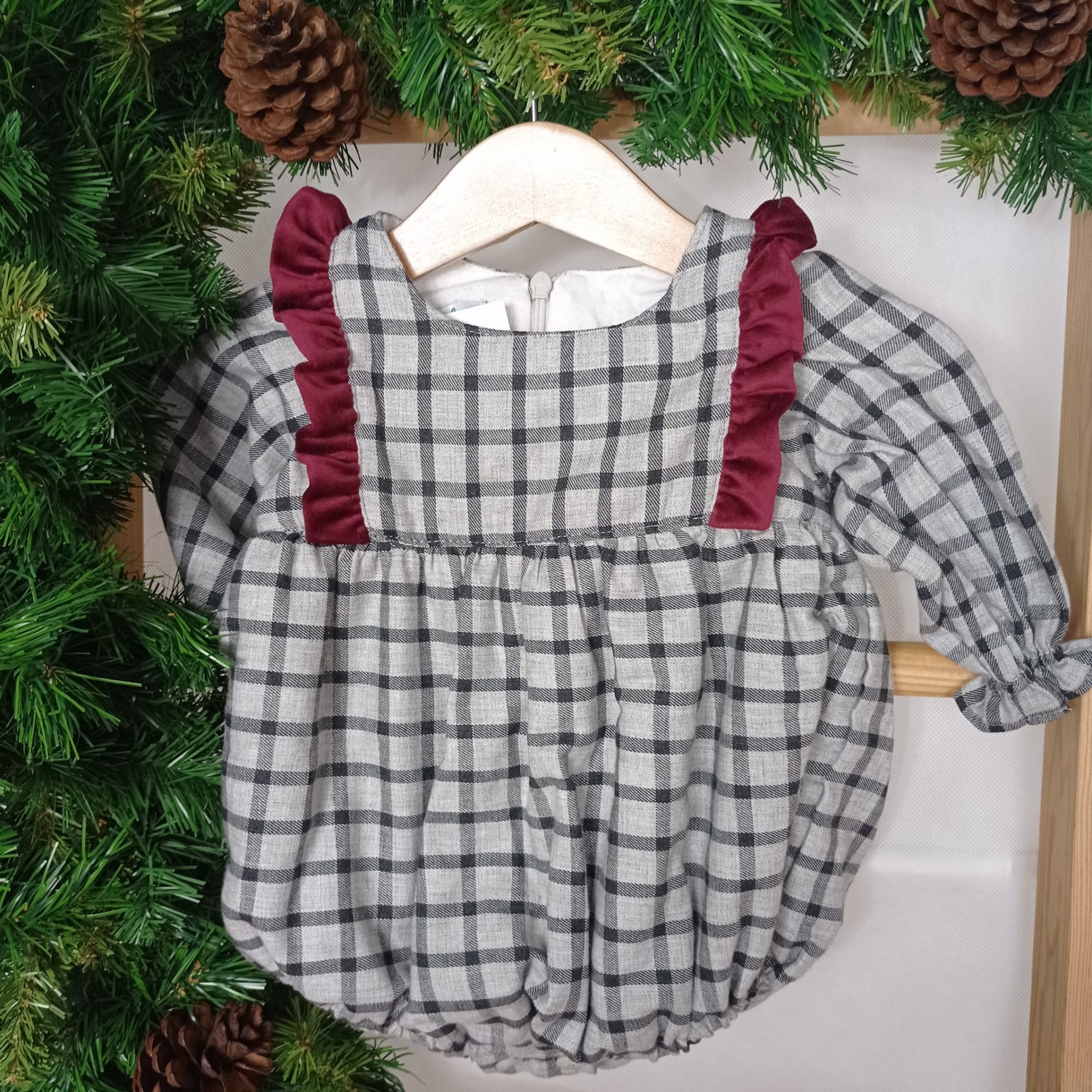 • Body de bebé xadrez cinzento e preto com folhos bordô nas alças