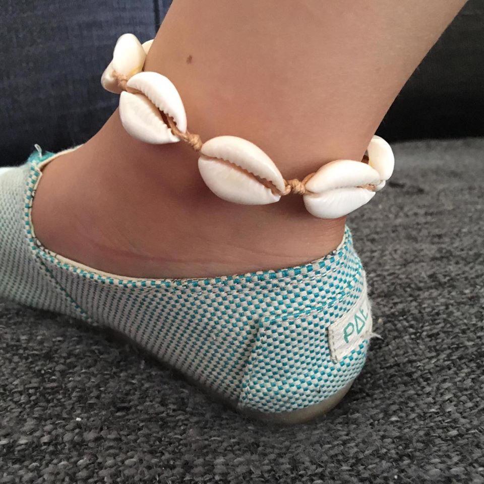 • Pulseira de búzios brancos no tornozelo com meia sapatilha azul e carpete cinza