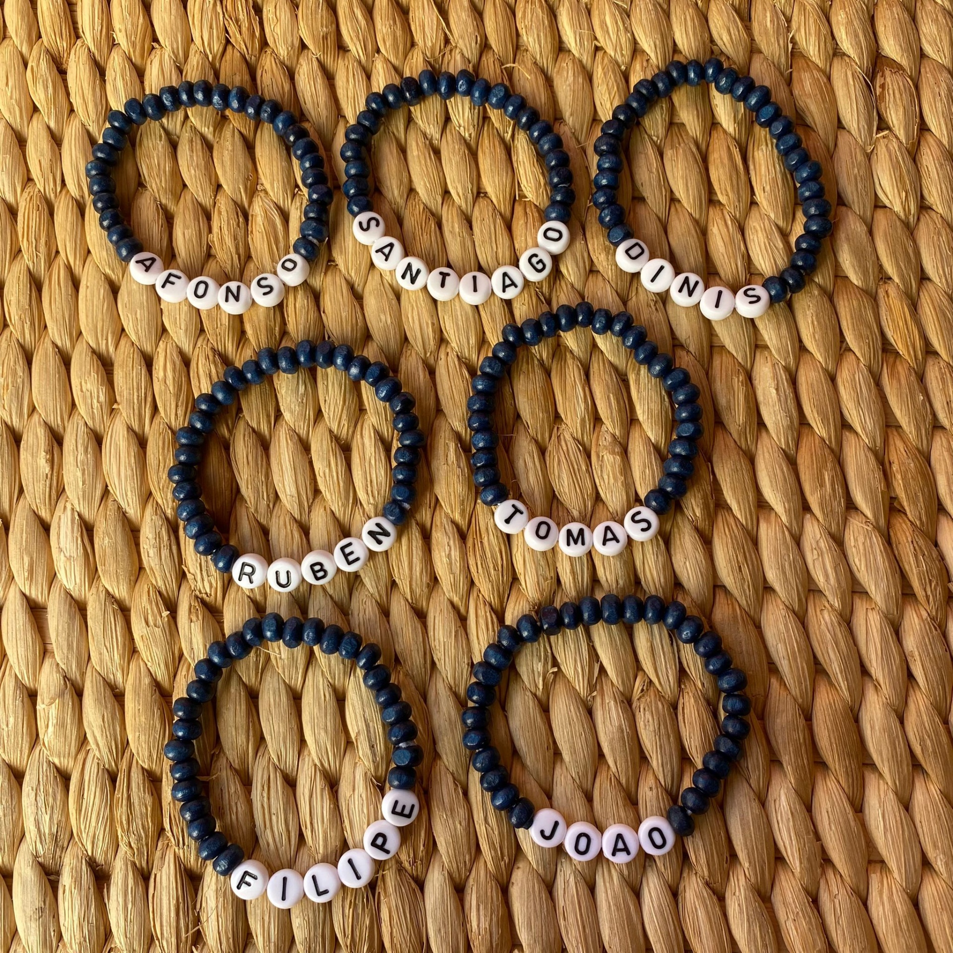Pulseiras com contas azuis e letras com nomes em contas brancas sobre superfície bege texturizada