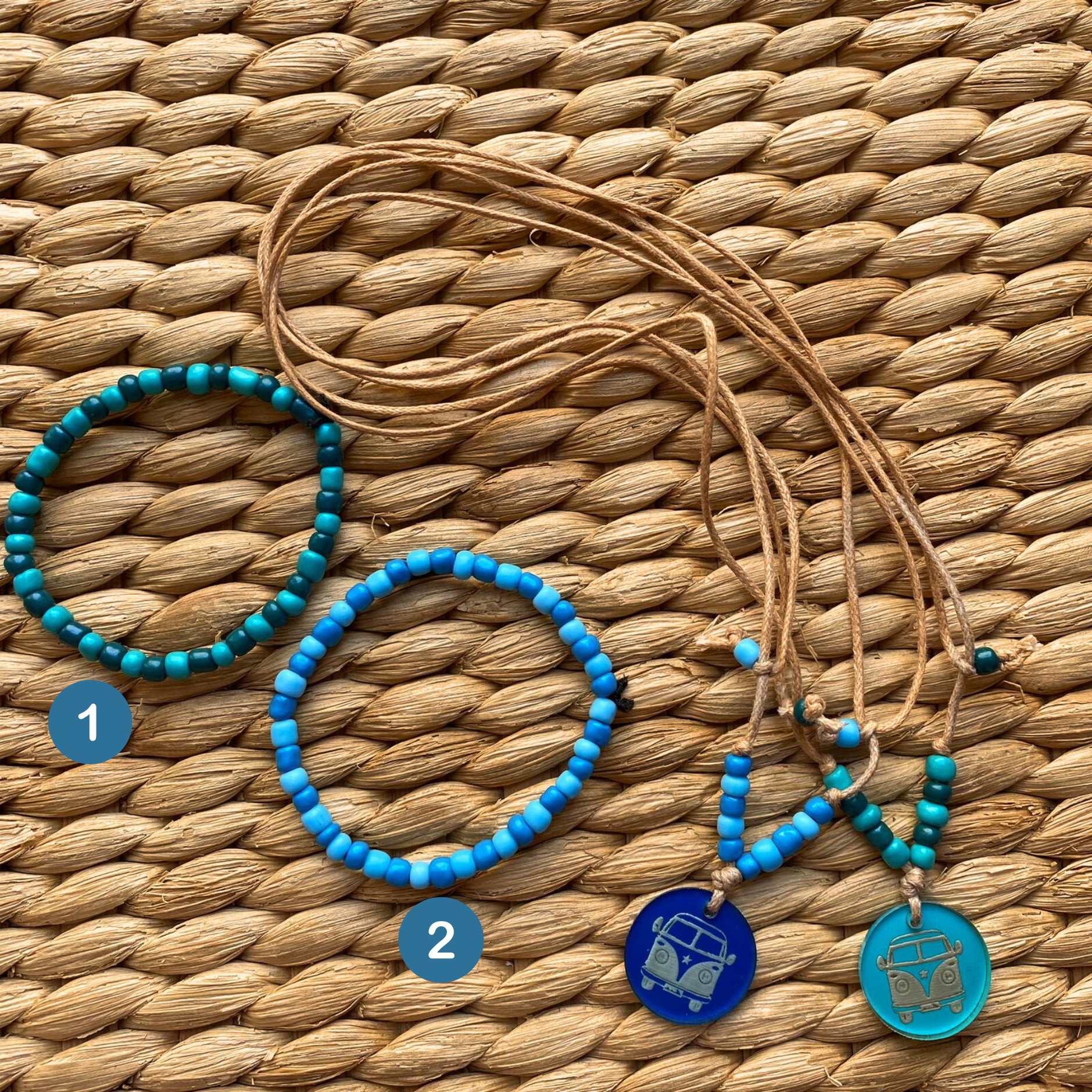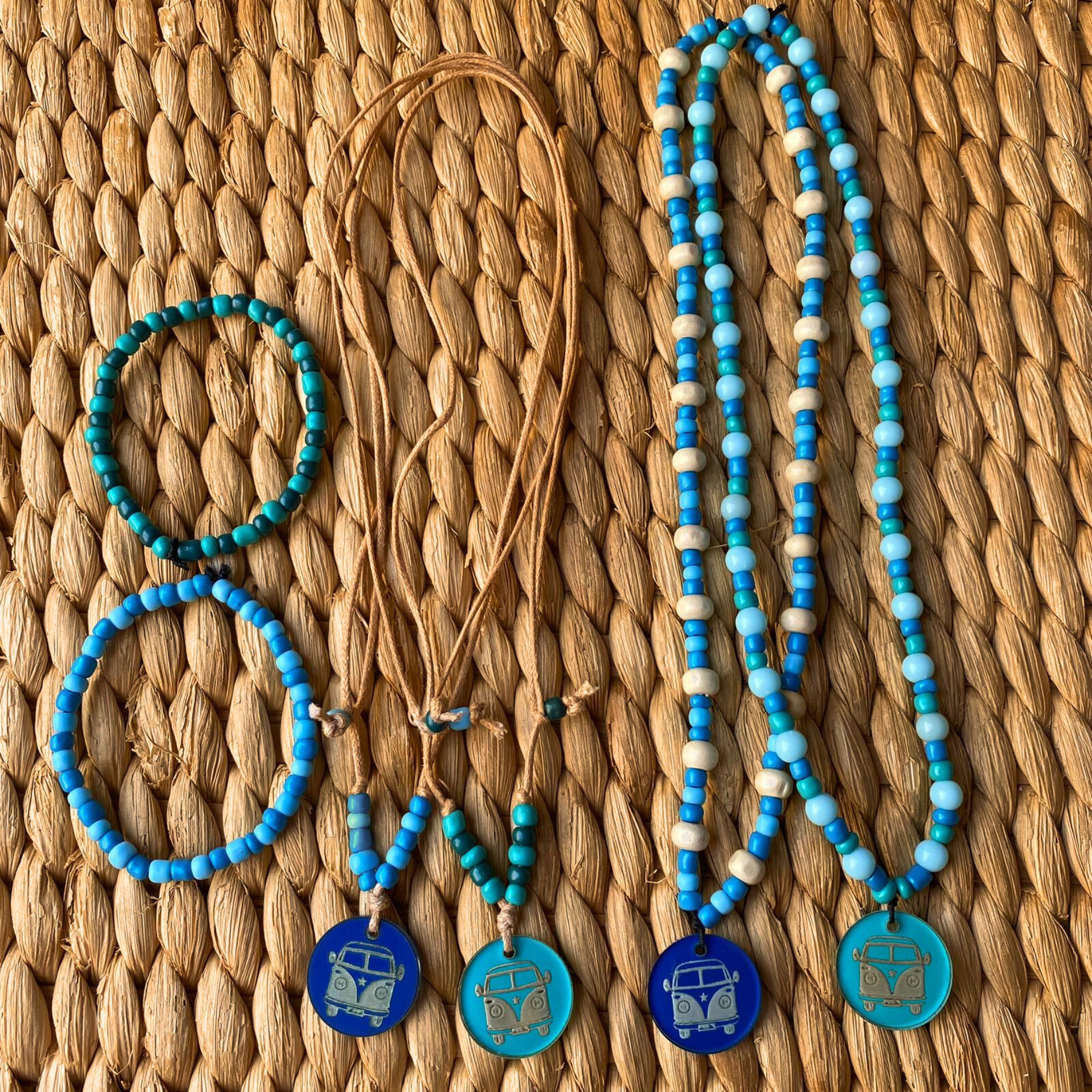 • Colares e pulseiras com contas azuis e verdes e pendentes com desenho de carrinha clássica