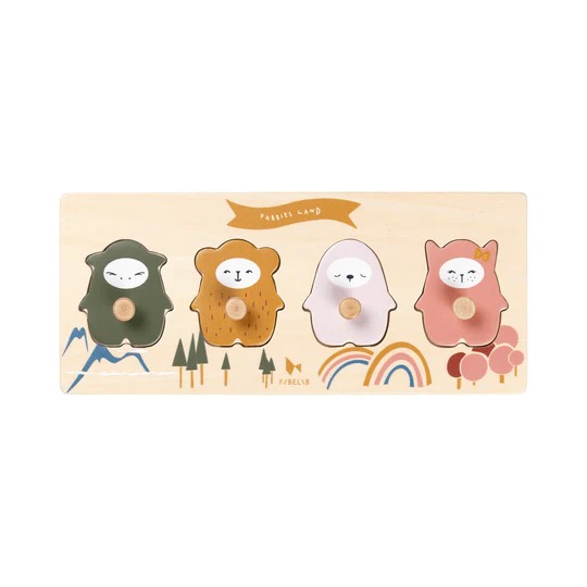 ♡ O puzzle de agarrar Fabbies Land da Fabelab é para os pequenos aprenderem a explorar e desenvolver o seu recém-descoberto controle motor fino. Cada puzzle de madeira tem um pequeno botão para agarrar e puxar facilmente o Fabbie favorito. Vem com quatro peças com cantos arredondados que para serem colocadas no respectivo recorte do tabuleiro. As peças e o tabuleiro ajudam a promover a compreensão das formas pela criança.