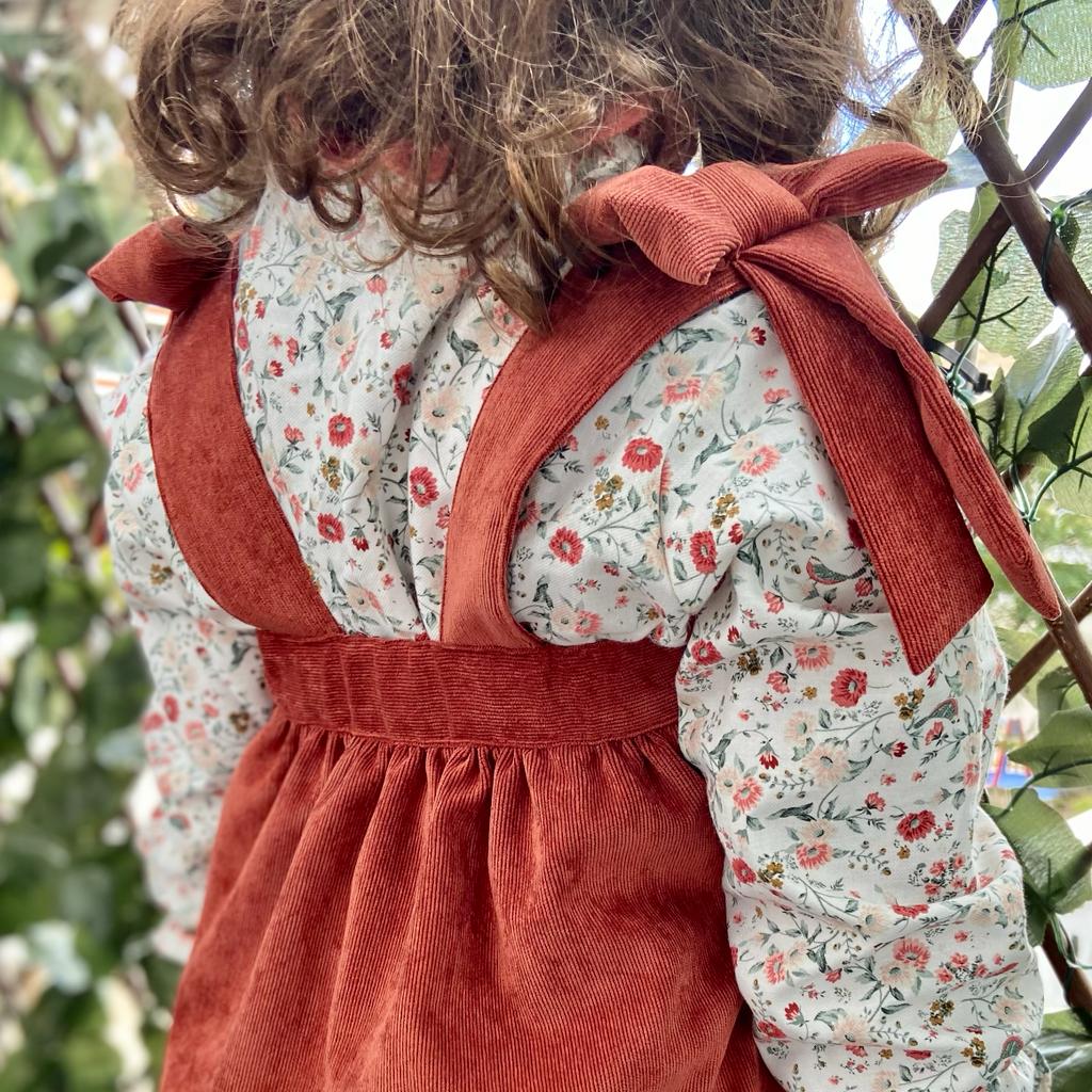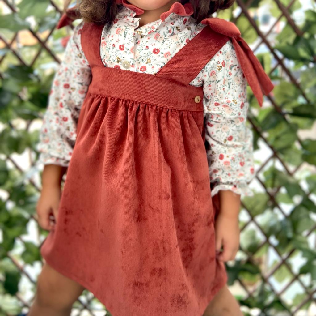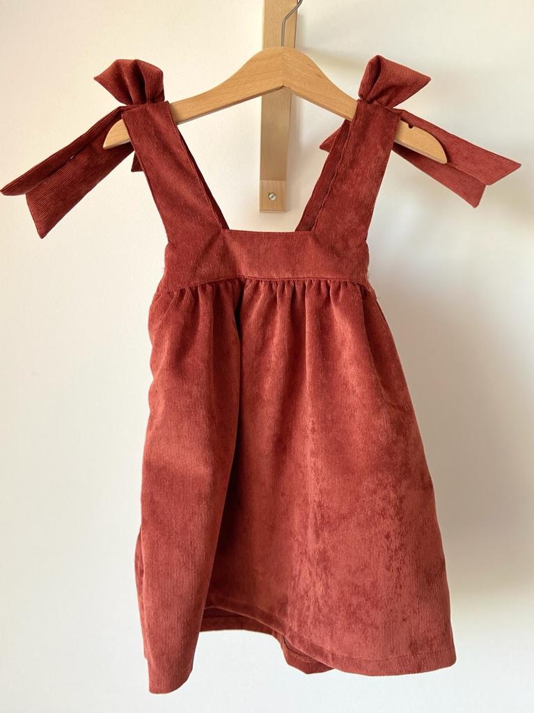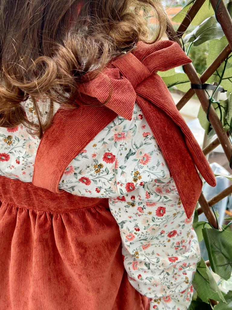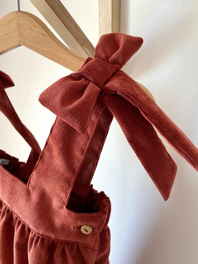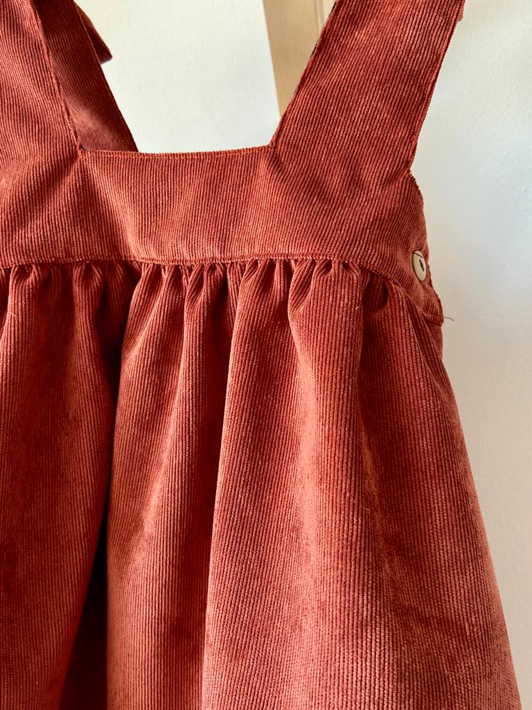 • Vestido de veludo cotelê terracota para criança com botão lateral de madeira
