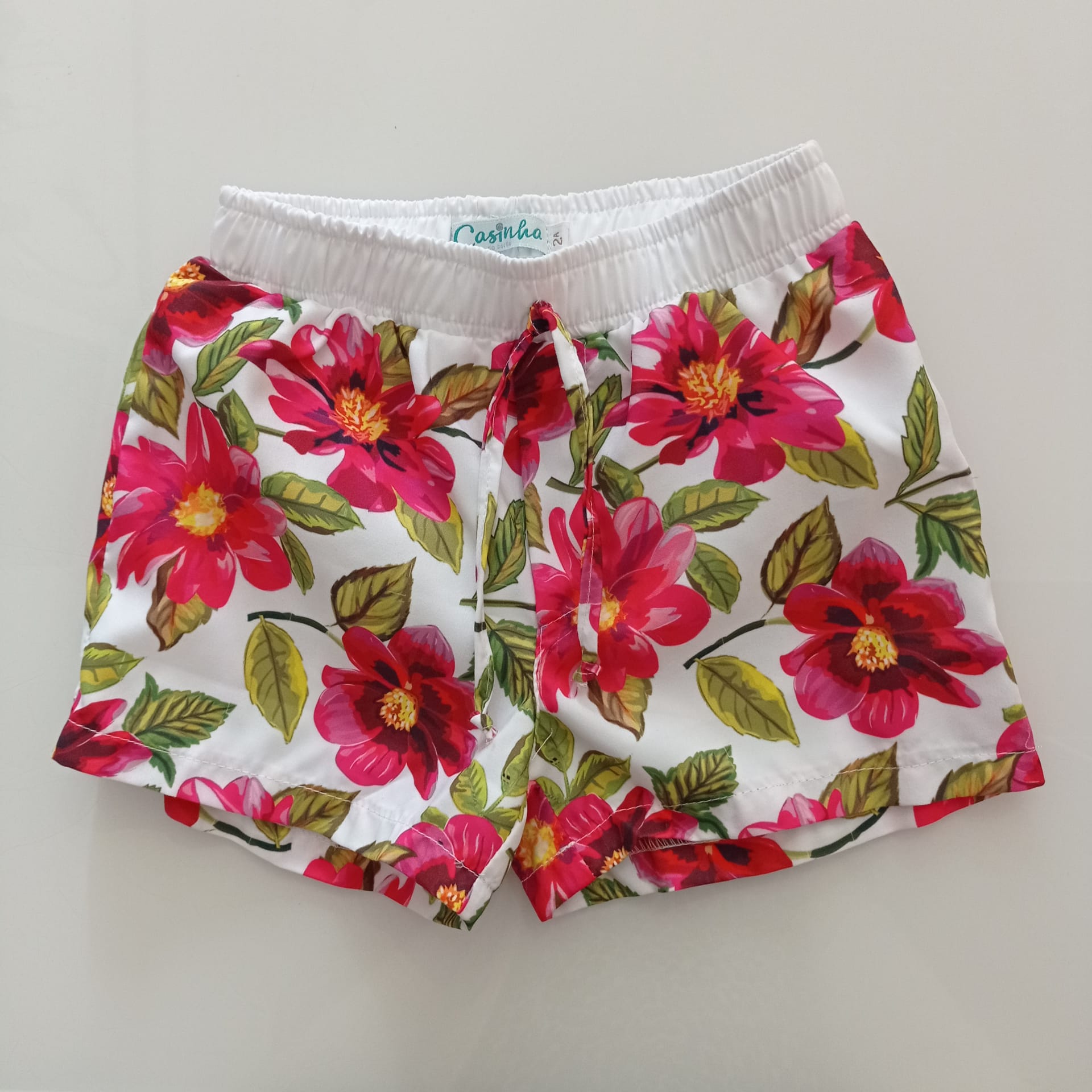 • Calções brancos com flores vermelhas e folhas verdes e cós elástico branco