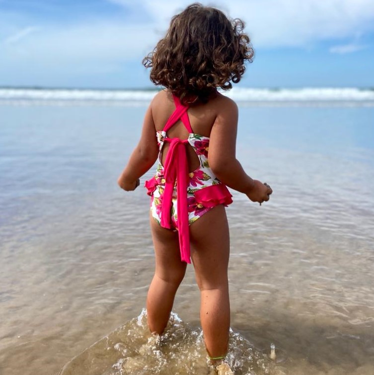 • Criança de costas usando fato de banho floral rosa e verde numa praia