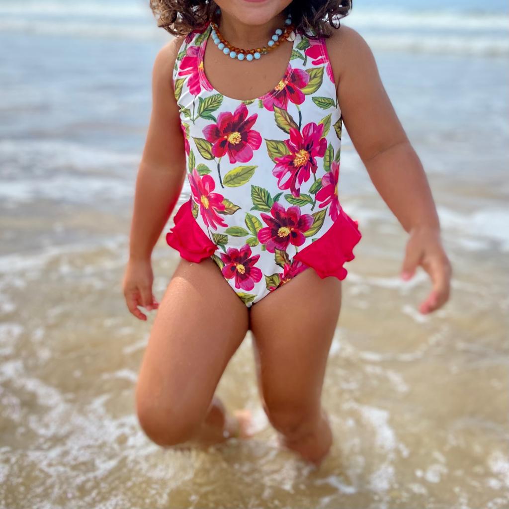 • Fato de banho infantil florido com folhos vermelhos na praia