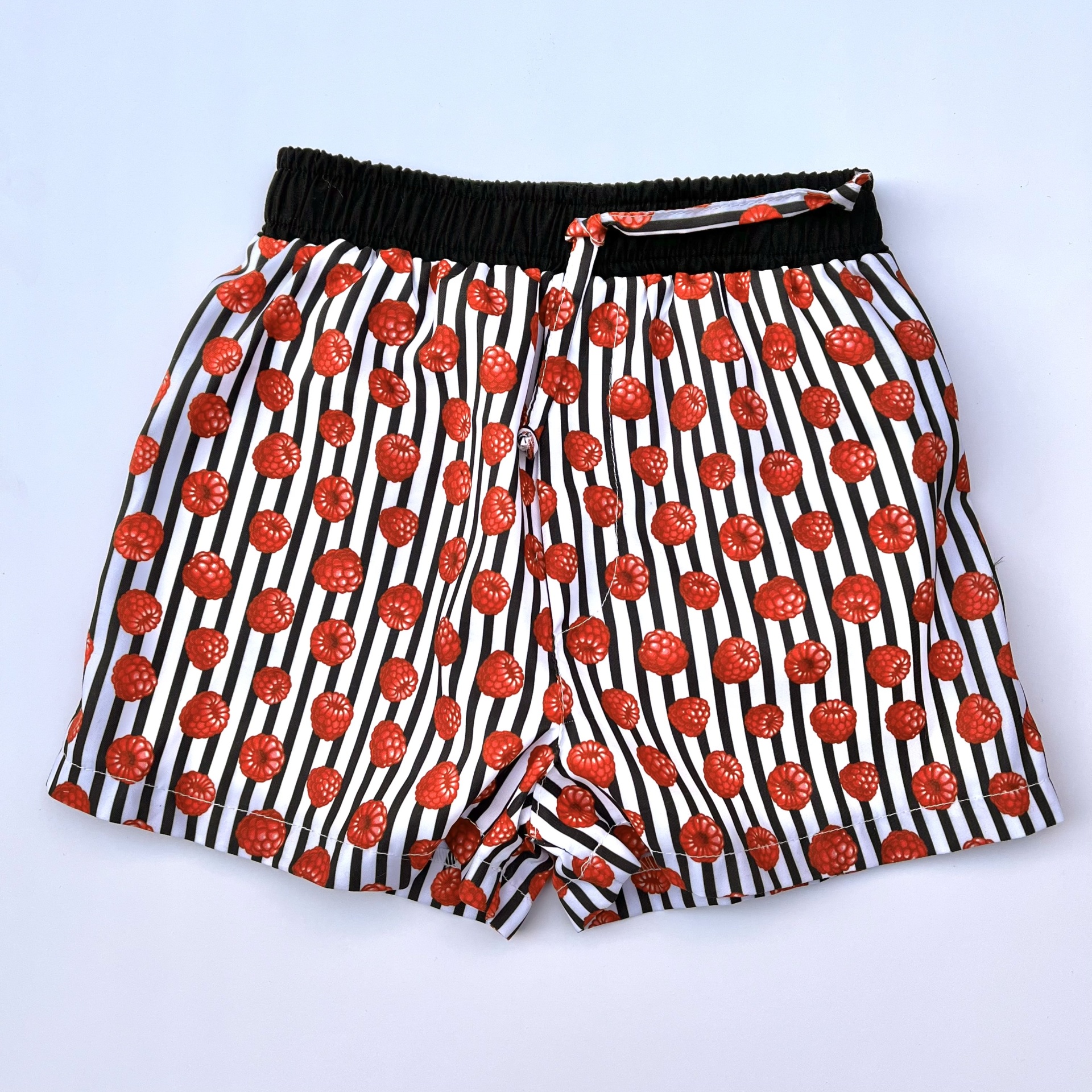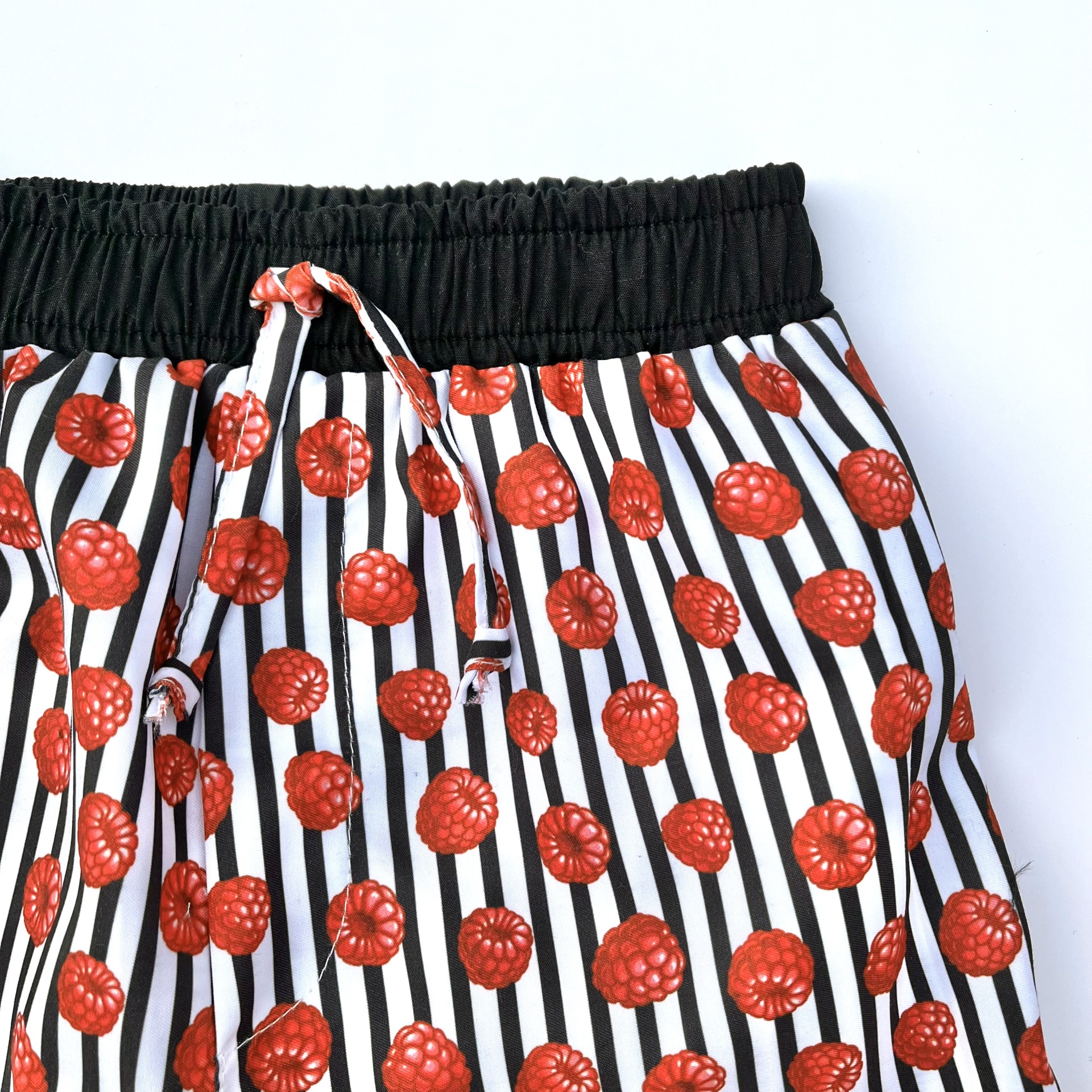 • Calções com riscas verticais e framboesas, cintura elástica preta com cordão.