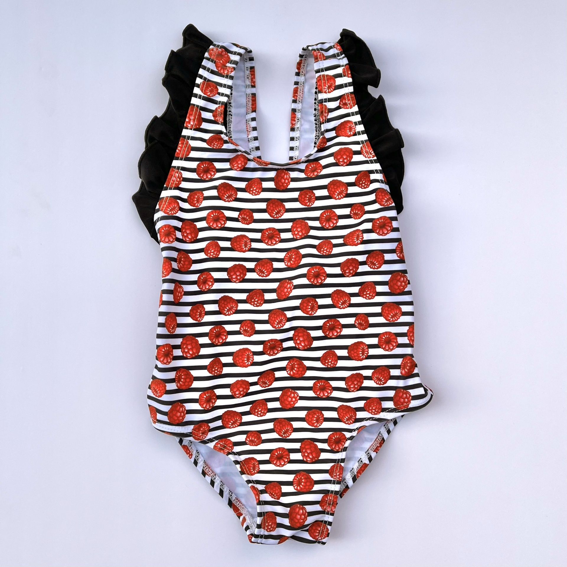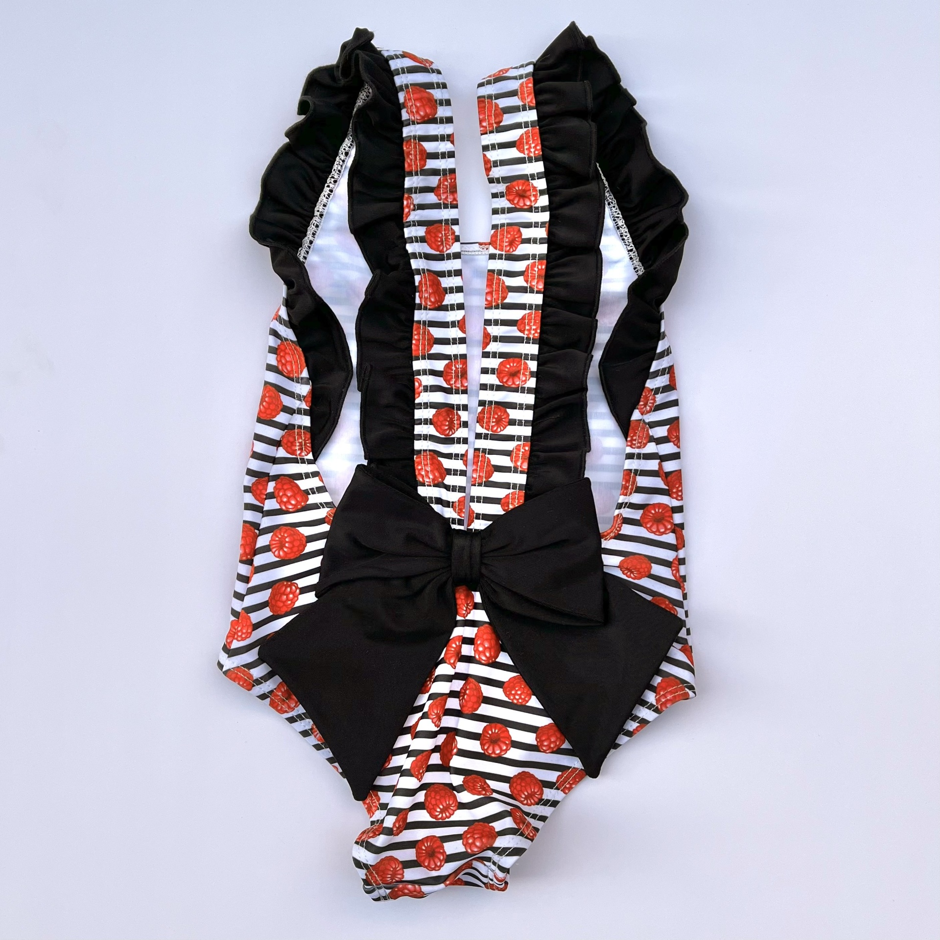 • Fato de banho infantil às riscas brancas e vermelhas com cerejas e detalhes pretos vista de costas junto à água